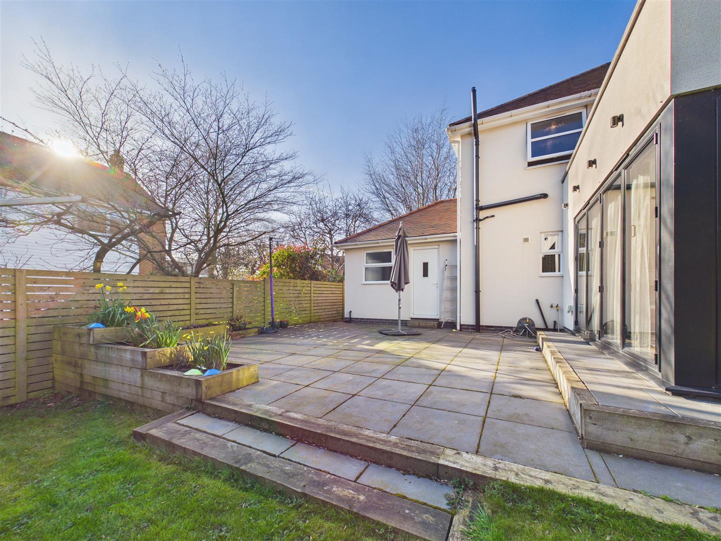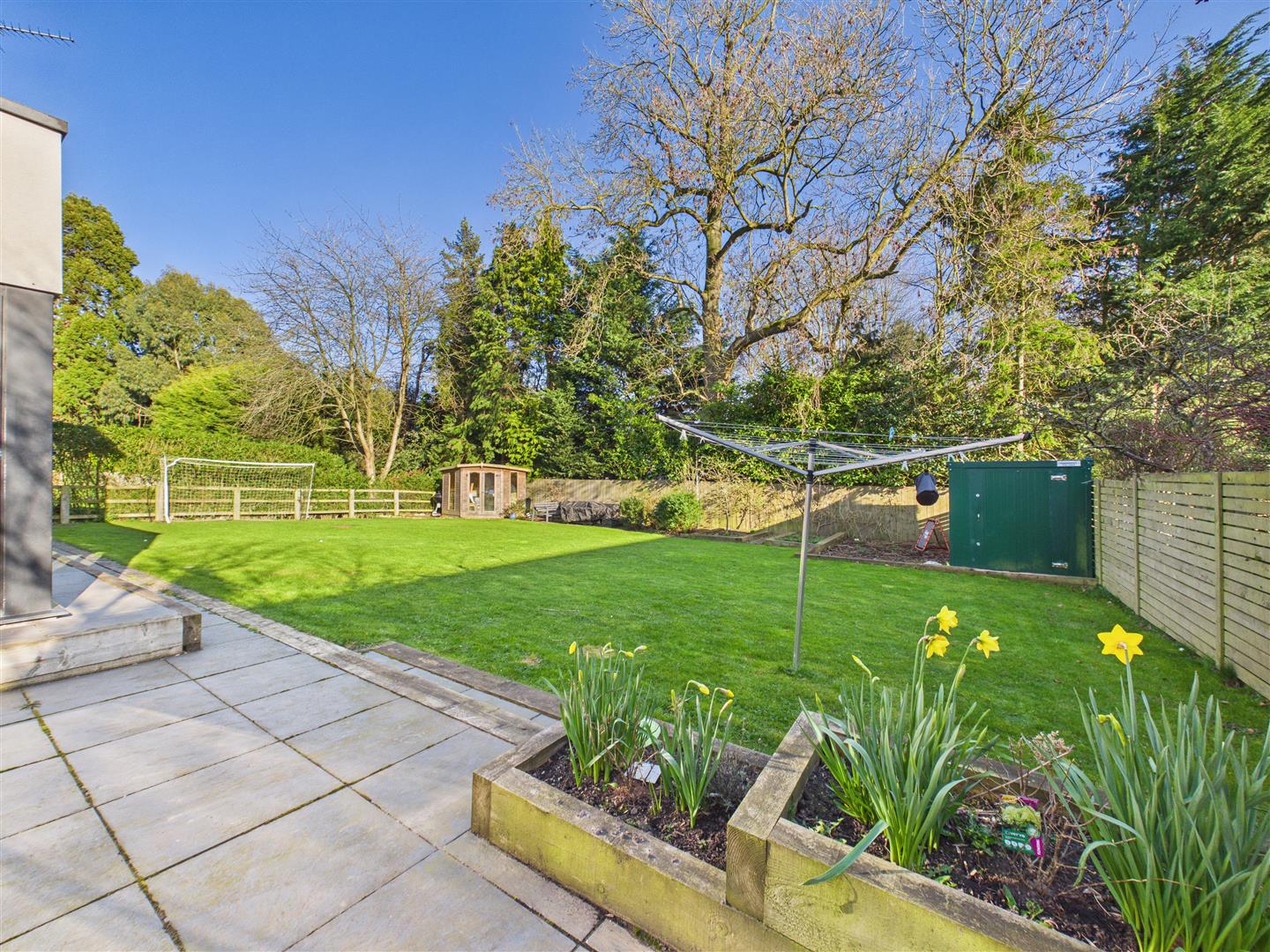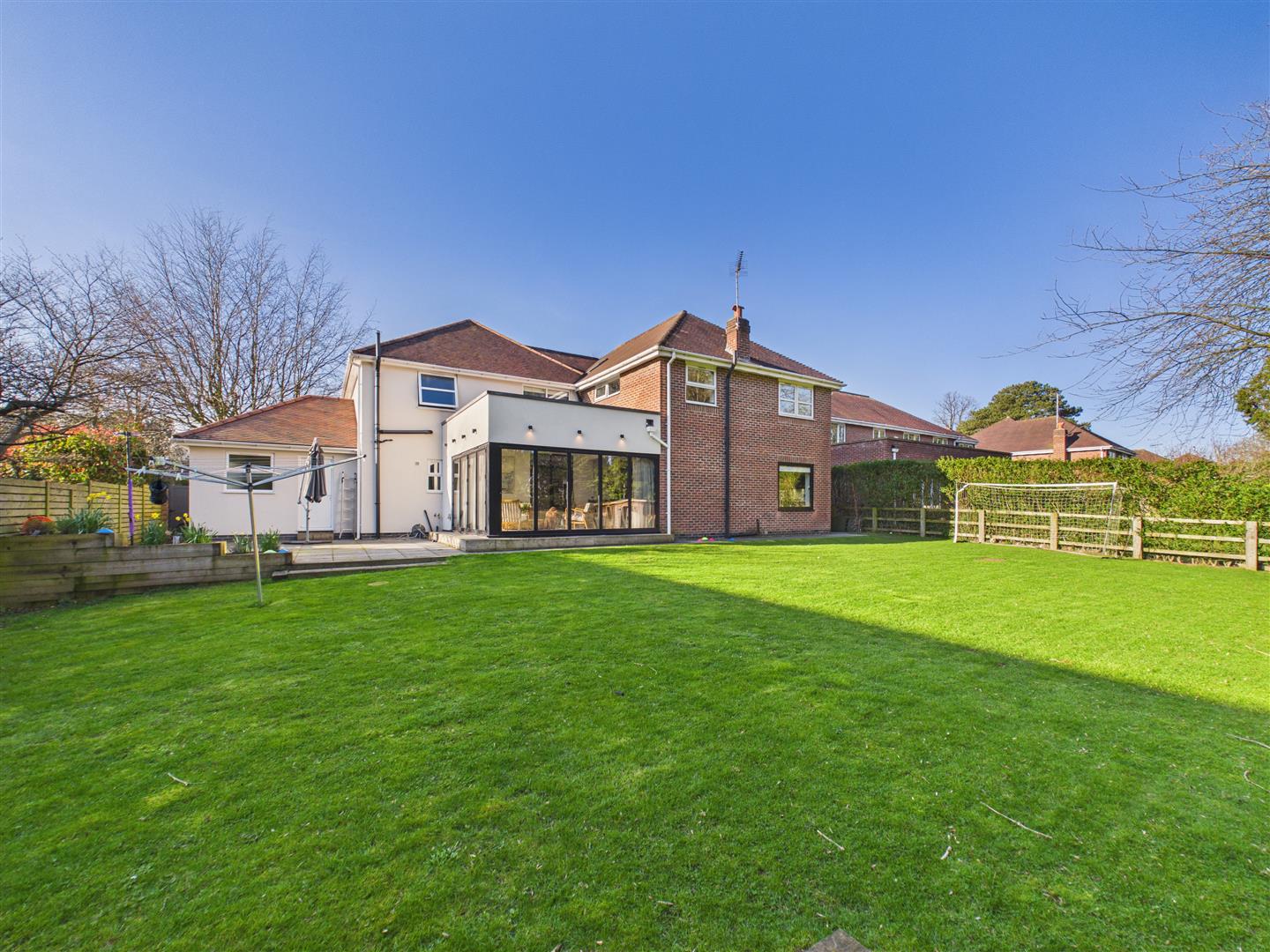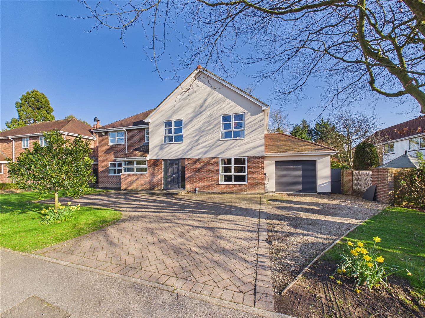 The property occupies a generous plot, with a block-paved and gravelled driveway providing extensive parking to the front. To the rear, the large garden is primarily lawned and framed by mature trees, featuring a substantial patio area perfectly suited for outdoor entertaining.