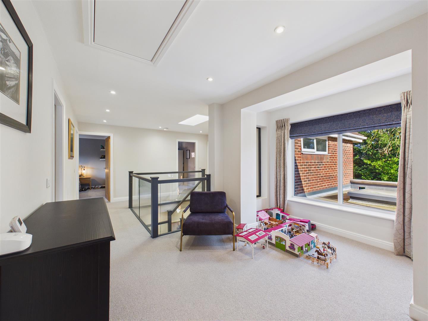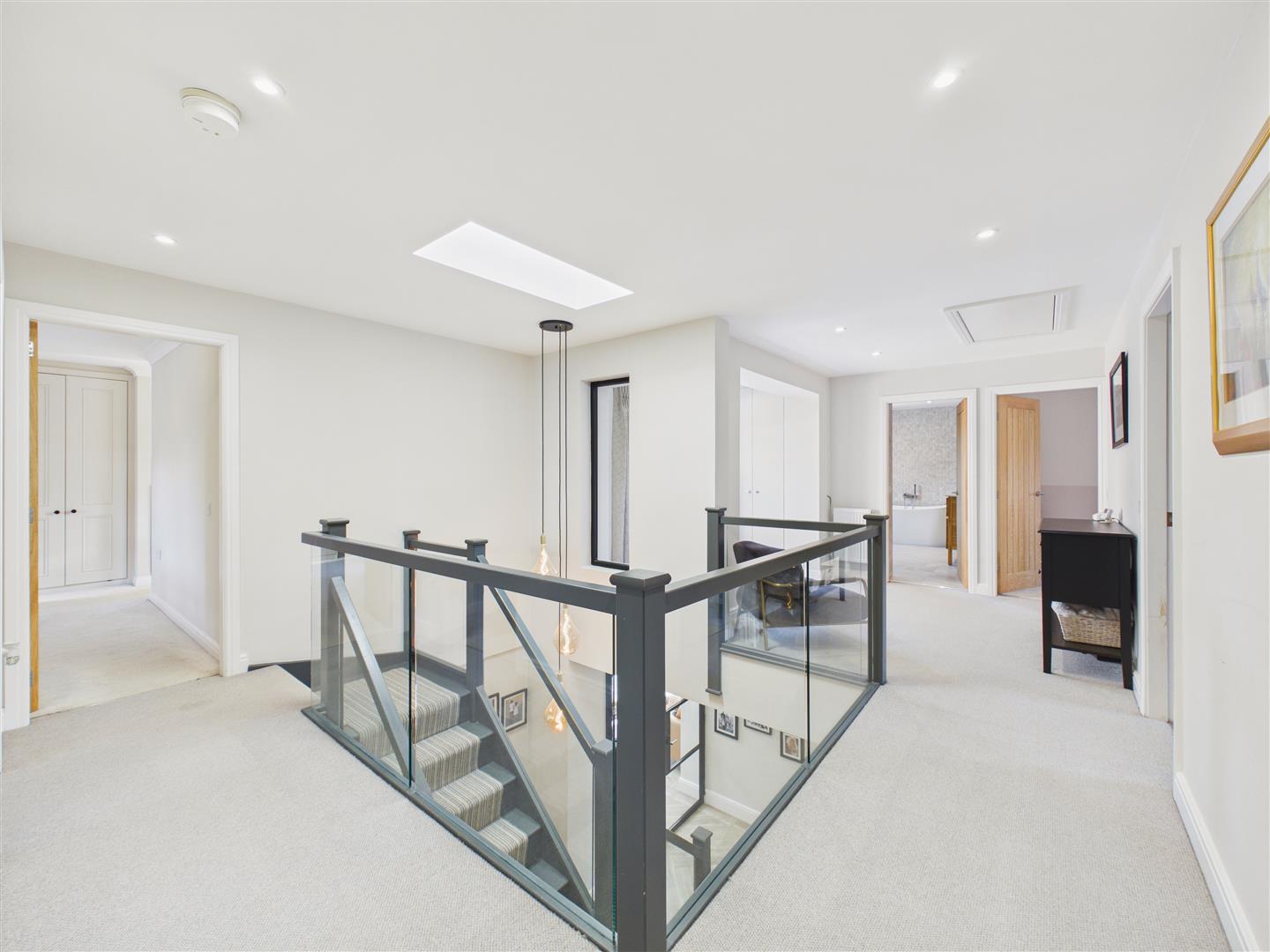 A light-filled and galleried landing with modern glass balustrades and a feature picture window overlooking the garden.