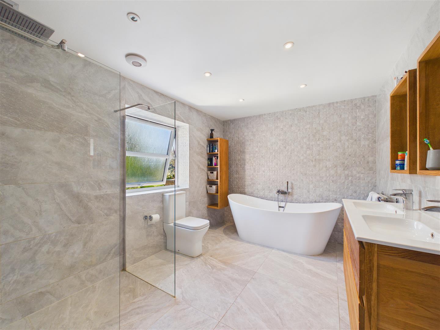 With luxurious suite comprising a bath with shower attachment, walk in shower with rainhead and hand held shower, vanity unit with twin basins, low flush W.C., tiling to walls and floor, heated towel rail, inset spot lights and window to rear.