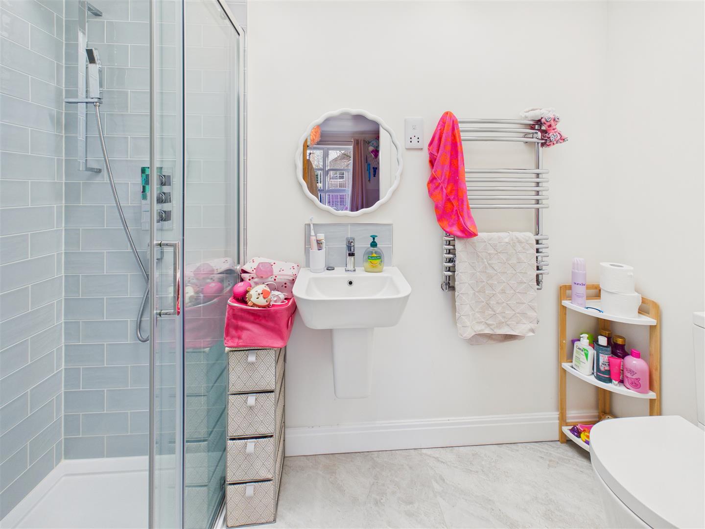 With suite comprising a bath with freestanding tap and shower attachment, shower enclosure, vanity unit with wash hand basin and low flush W.C. Tiling to floor and walls, heated towel rail and window to side.