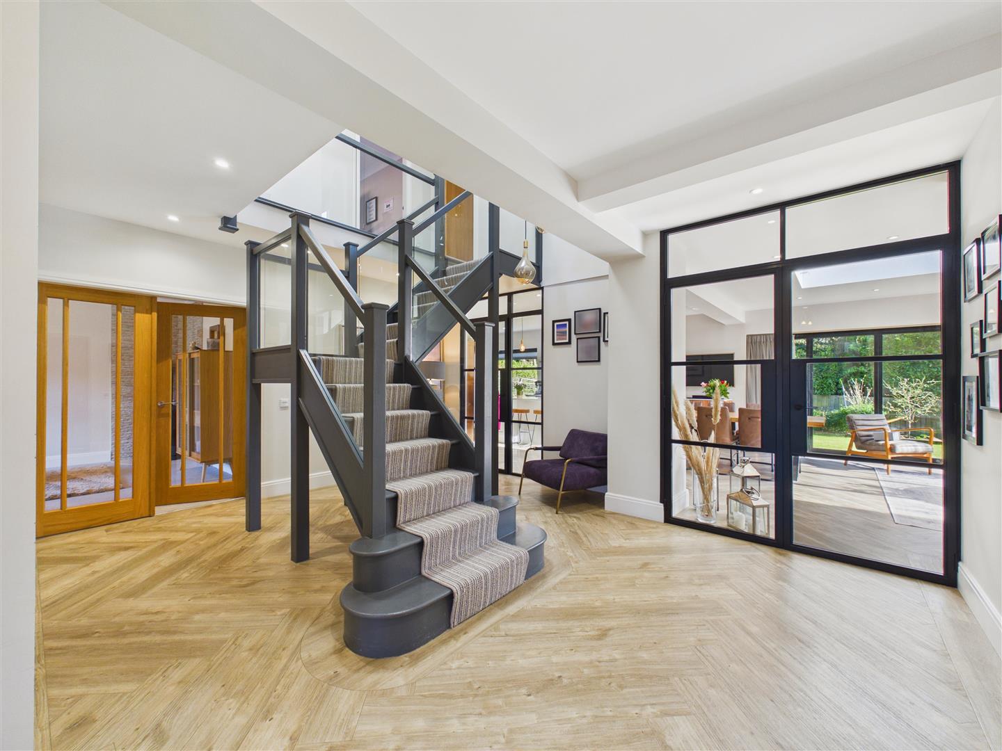 This impressive space features Amtico flooring with underfloor heating, The central staircase with glass balustrade leads up to the galleried landing. Contemporary glass and black panelled doors lead through to the fabulous living kitchen.