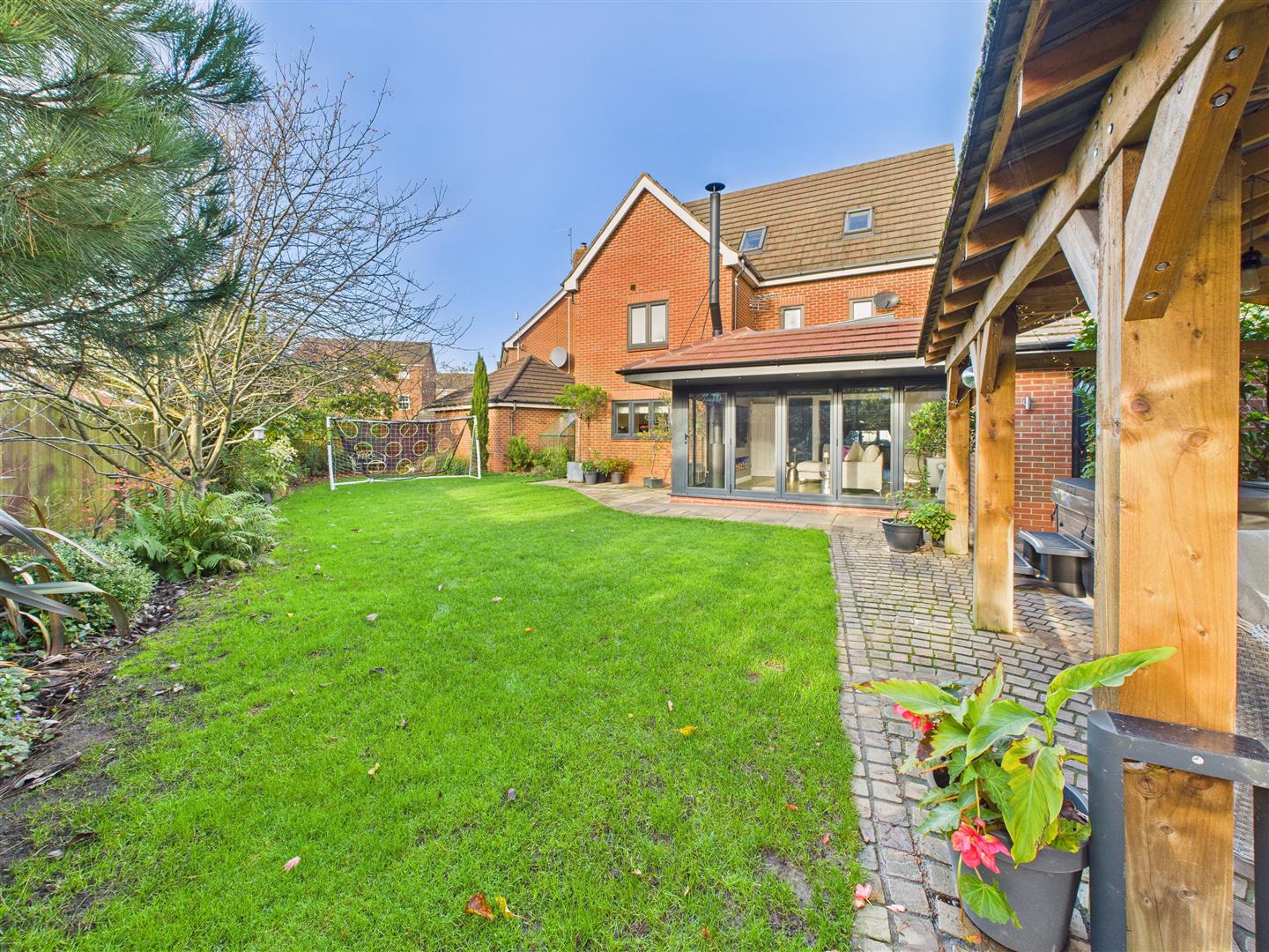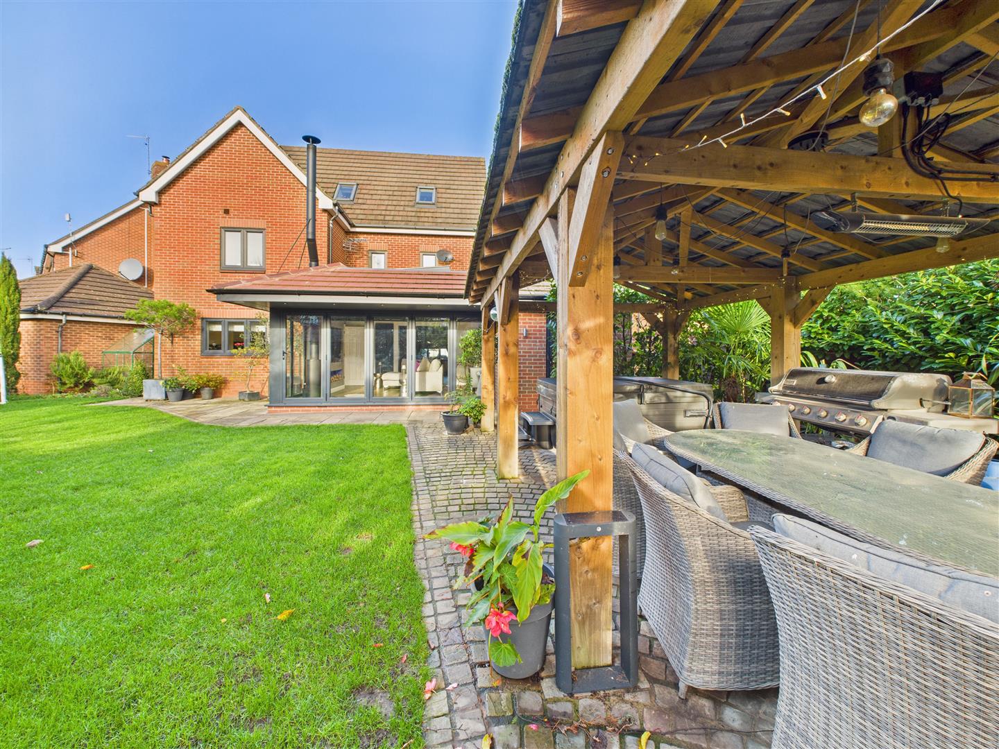 Outside is equally as impressive. The large rear garden enjoys a superb south-facing aspect and features a covered patio area and an extensive lawn. For entertaining, there is a separate patio and a large, sheltered pavilion area, perfectly positioned to capture the evening sun. To the front, a driveway offers parking for up to three vehicles and leads to the integral garage.
