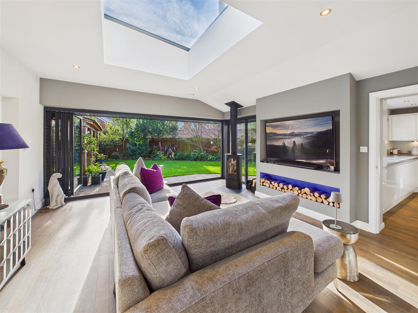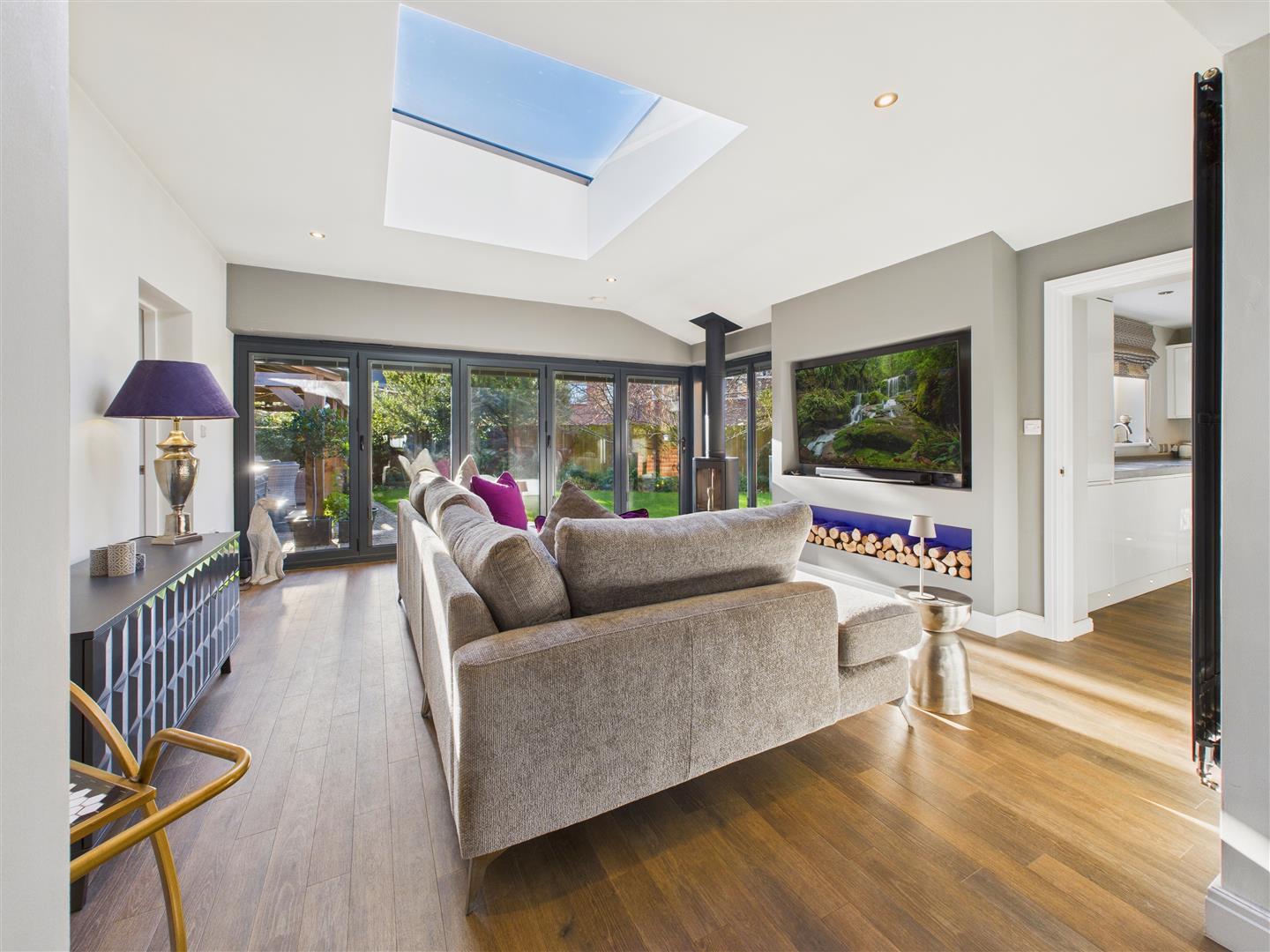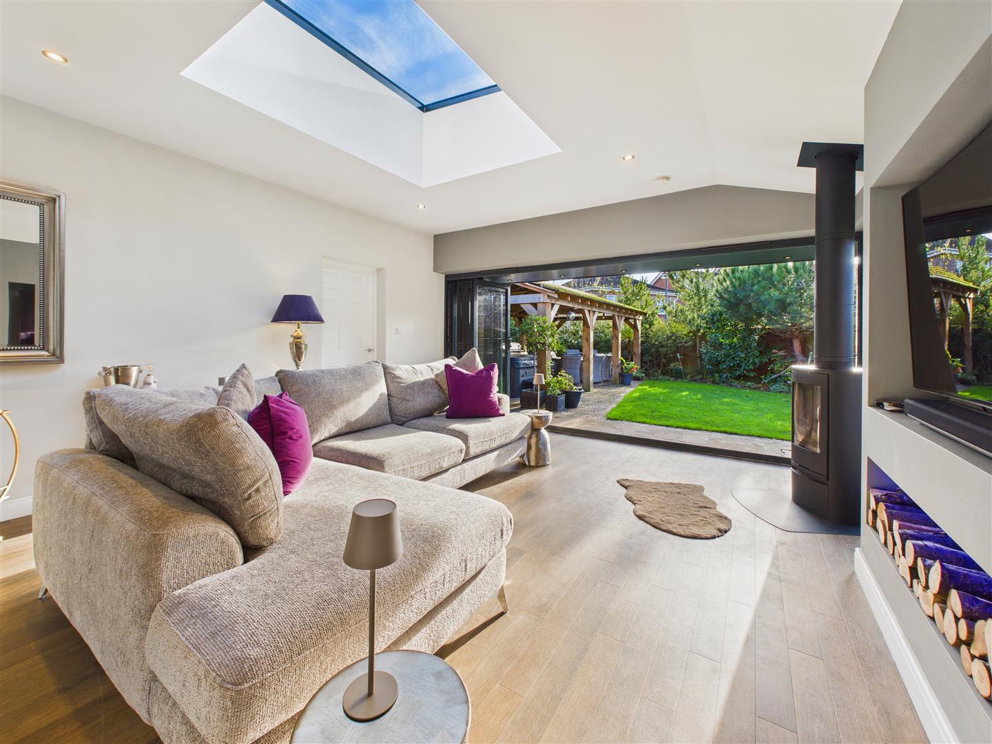 With bi-fold doors to the garden, central skylight, log burner to the corner and media wall with log storage space.