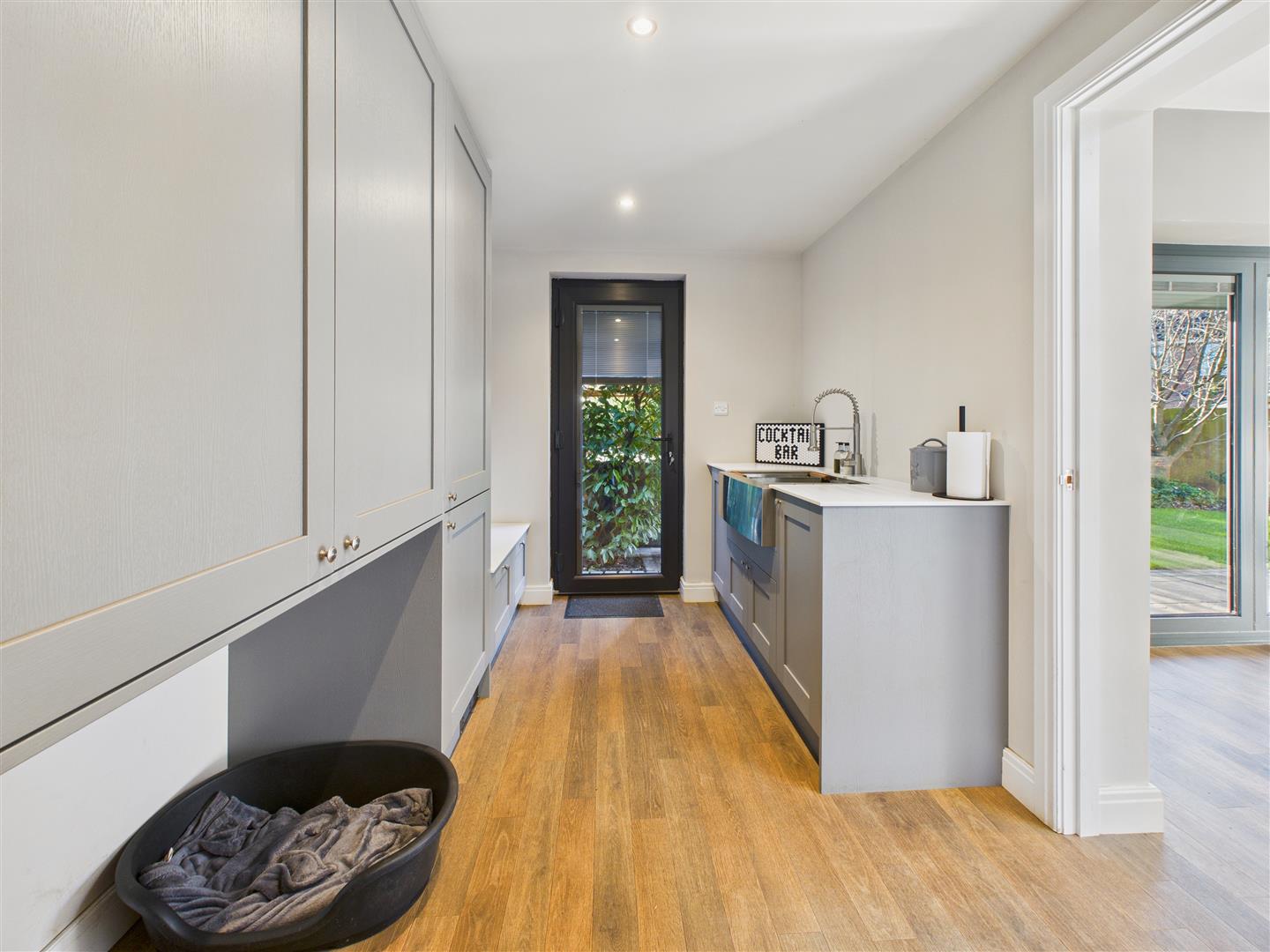 Comprising fitted units and worksurfaces, seat and shoe storage, sink & drainer, doors to the integral garage and rear garden.
