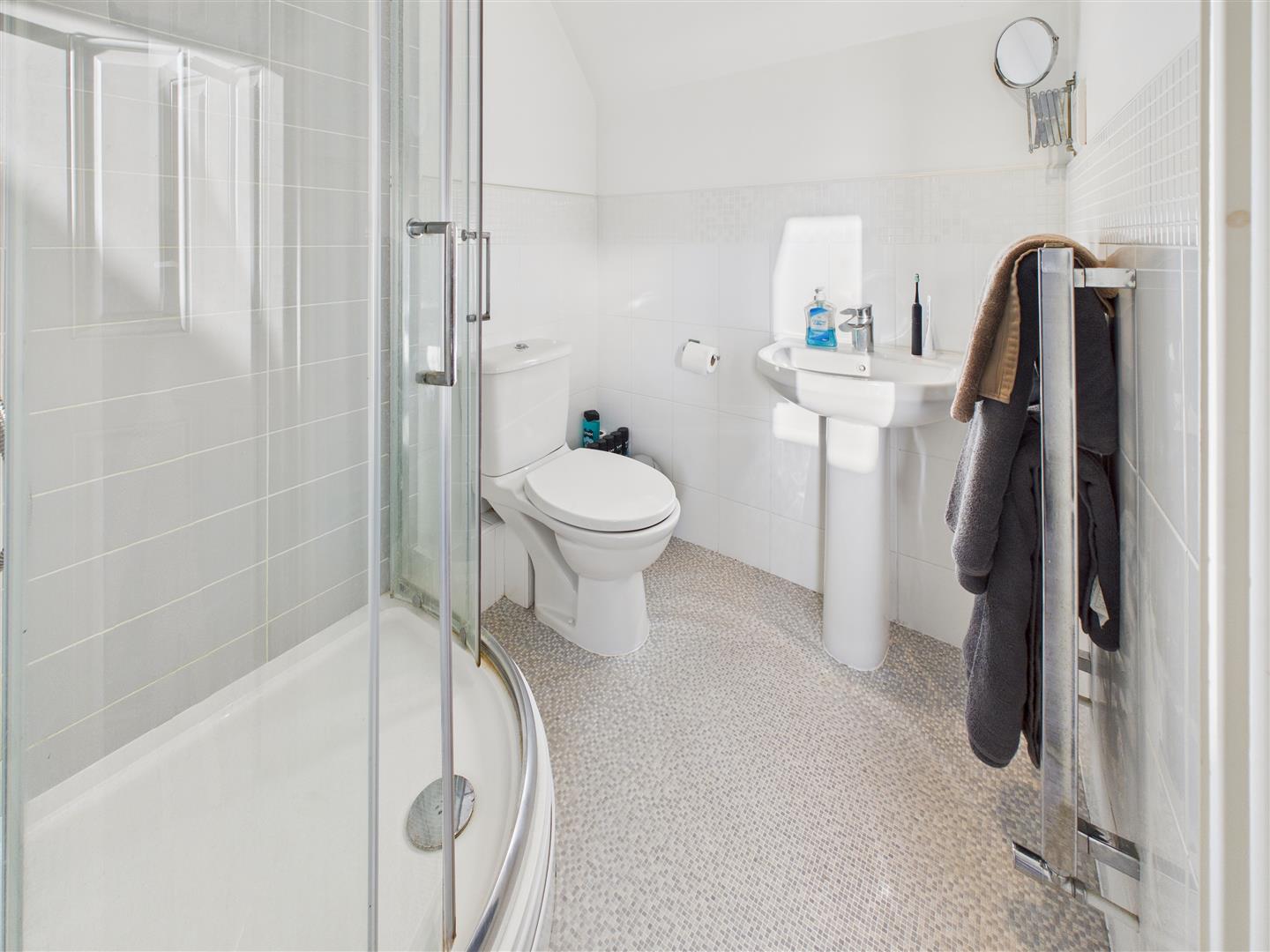 Half-tiled with a step-in shower enclosure, low-flush W.C. beneath window to the side elevation and wash-hand basin.