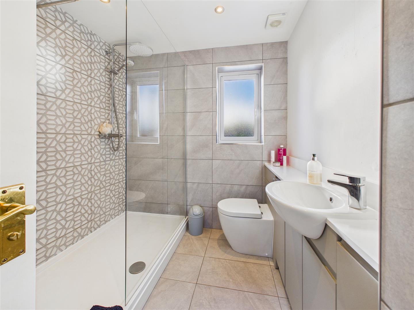 Tiled en-suite comprising walk-in shower, low-flush W.C., wash-hand basin atop fitted vanity cabinet and window to the rear elevation.