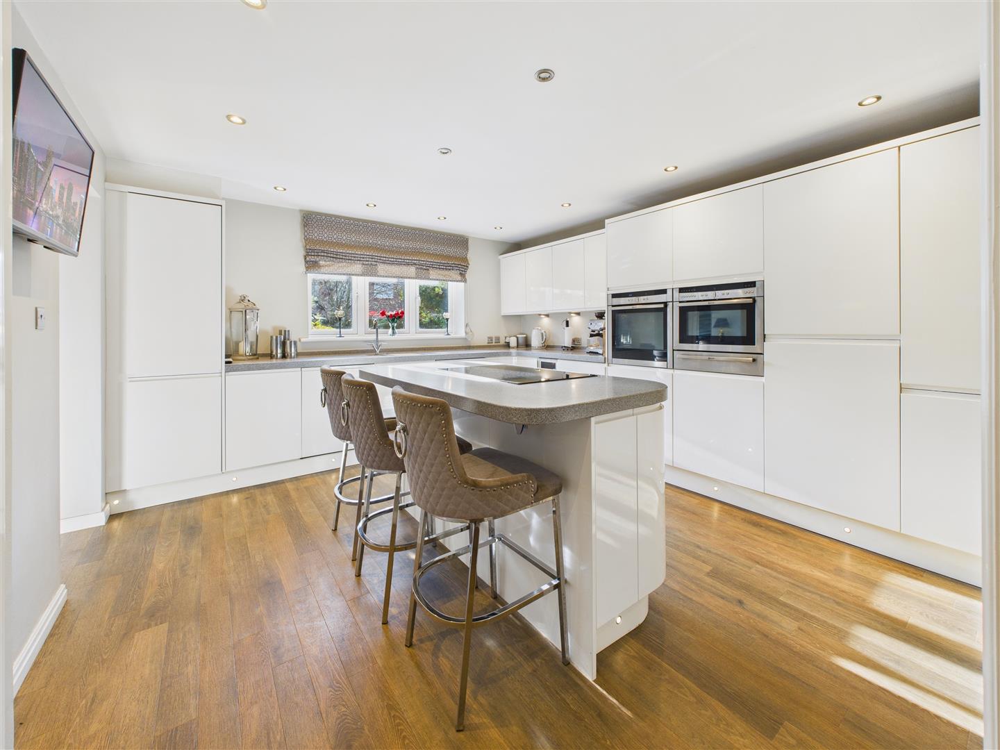 Contemporary space with fitted units and worksurfaces, boasting a range of integrated appliances including oven, microwave/oven, warming drawer, bottle cooler, fridge-freezer, dishwasher and plumbing for a washing machine. A one-and-a-half sink & drainer lies beneath a window to the front, and a central island acts as a focal point with a five-ring induction hob and breakfast bar area. The space to the front of the property has been converted into a dining area.