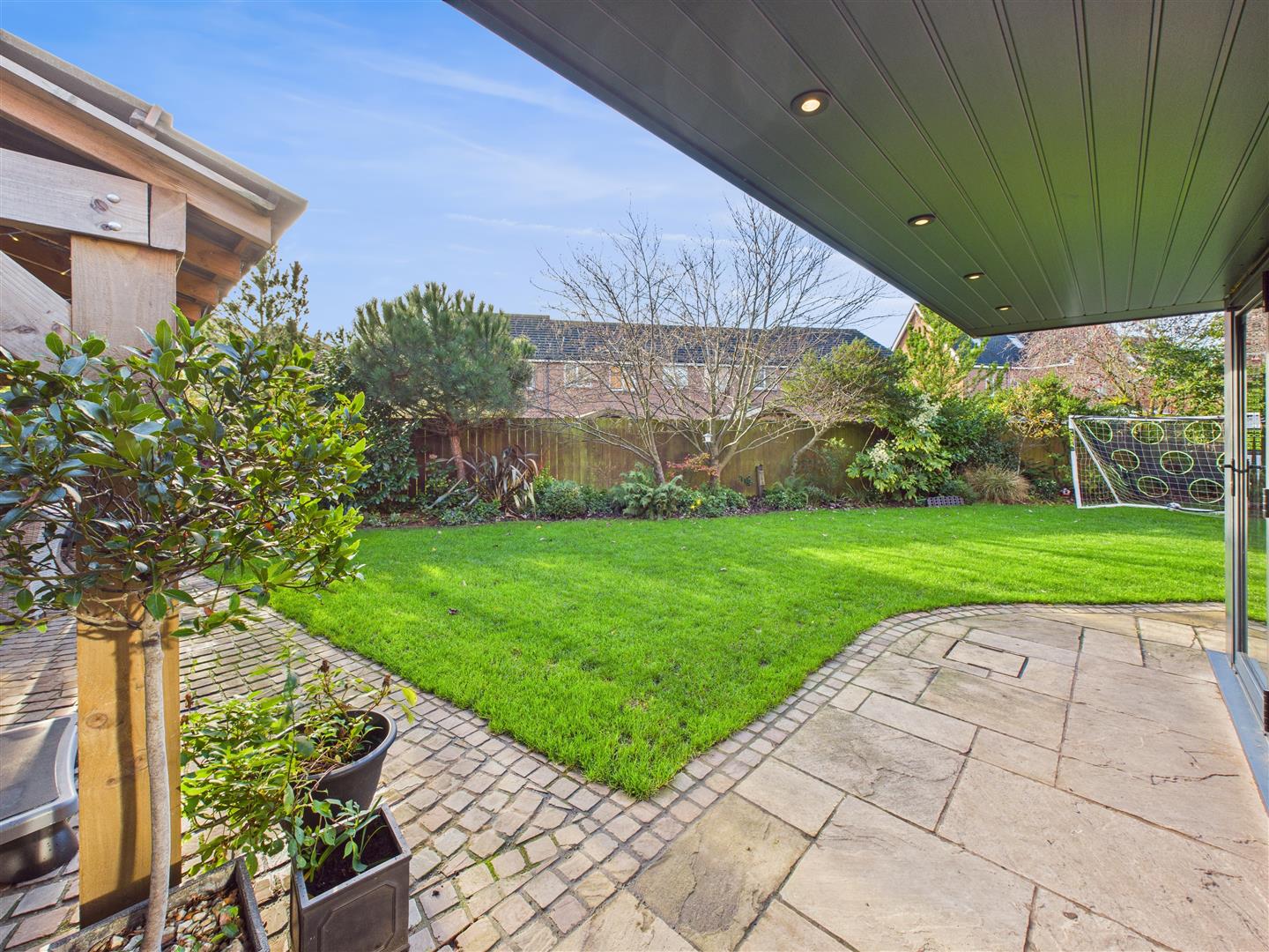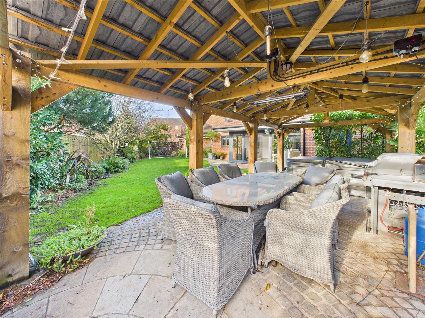 A covered patio extends from the garden room to the immediate rear of the property, with a lawned area covering the majority of the south-facing rear garden. There is a patio and large sheltered pavilion area for entertaining, ideally placed to catch the evening sun. To the front, a driveway provides parking for up to three vehicles, also leading down to the integral garage.