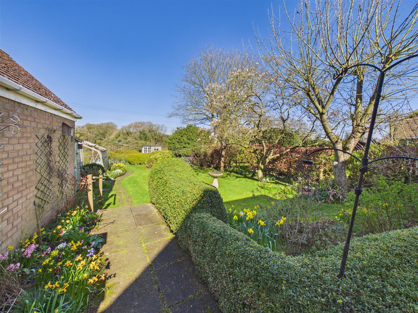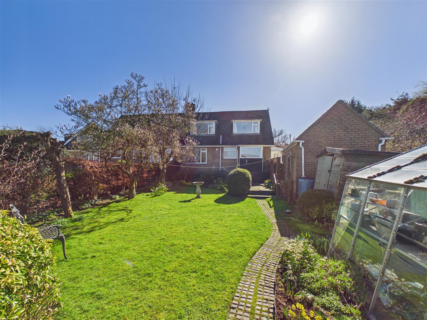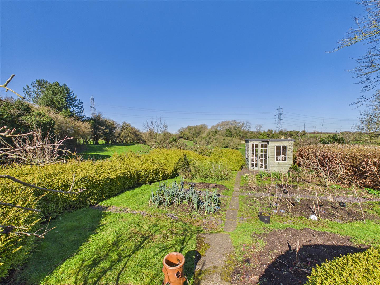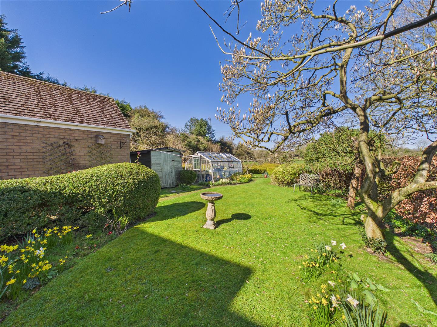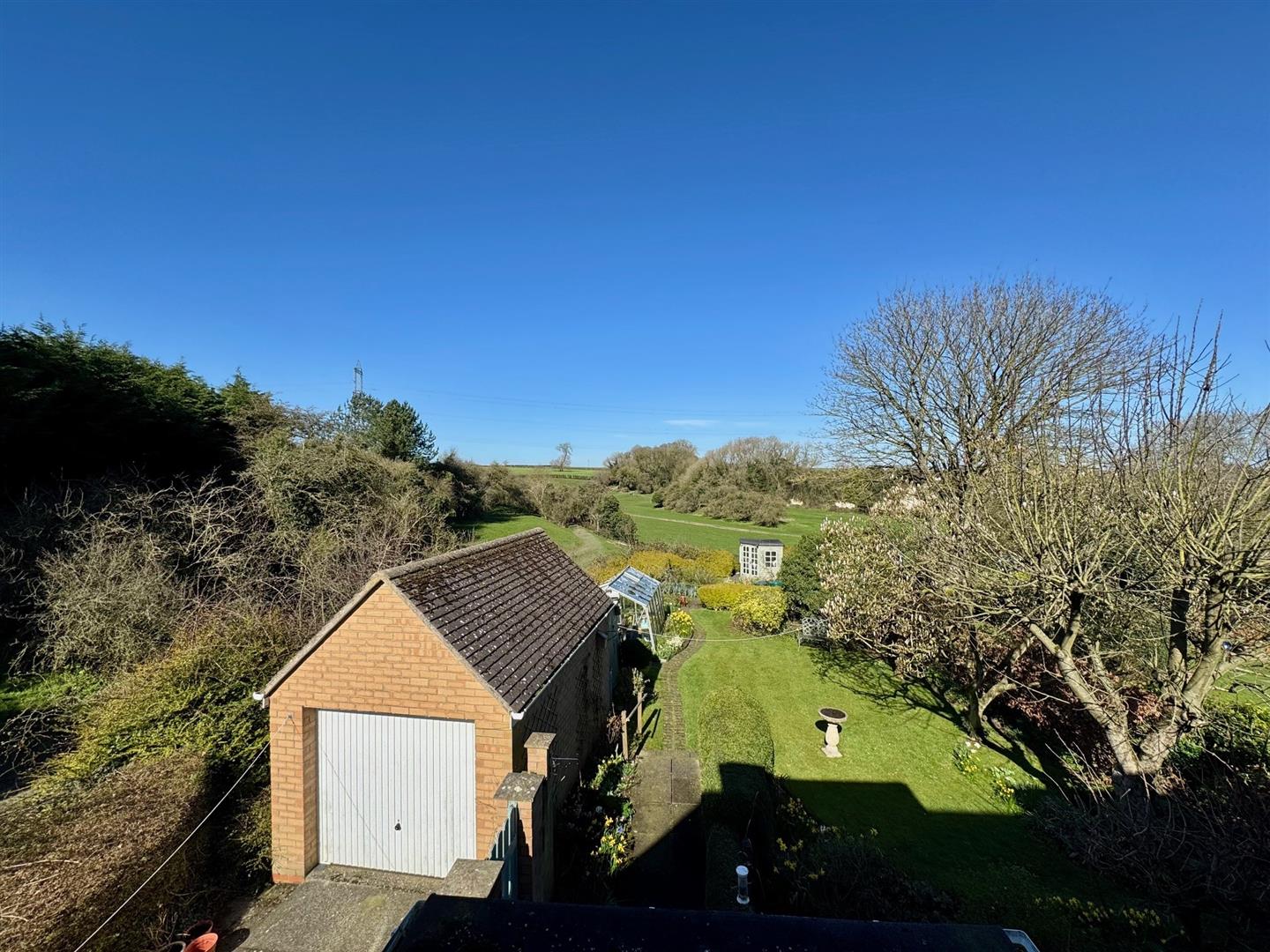 An attractive ornamental garden with curved low brick wall with raised borders being well stocked and with box hedging to the front. With many areas of interest, the rear garden has a beautiful aspect to the rear across the rolling landscape. Features include patio areas, shaped lawn and well stocked borders together with veg patch, greenhouse, shed and summerhouse to the far corner. A side drive provides access to the brick and pitched tiled roof garage.