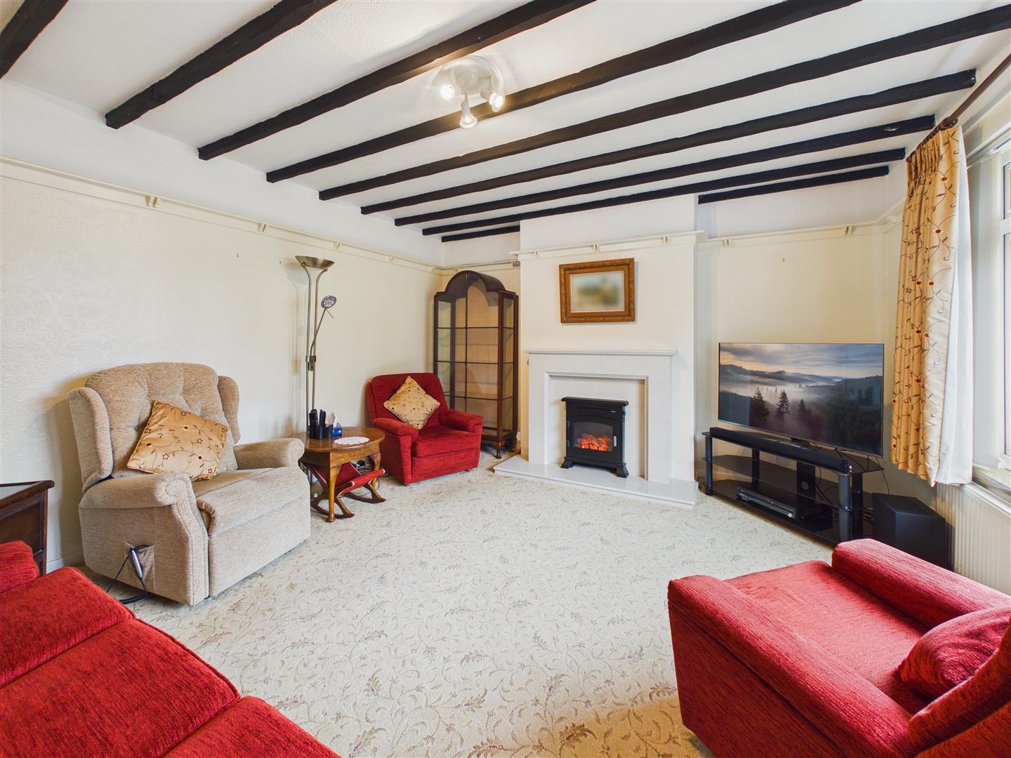 A lovely lounge with decorative beams to ceiling, picture window to front, feature marble fire surround with electric fire, delft rack to walls.