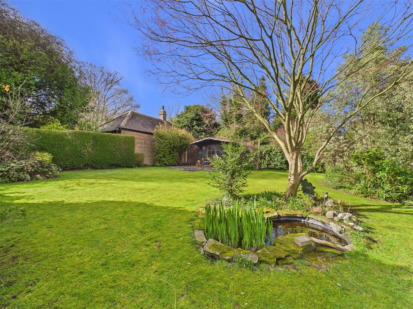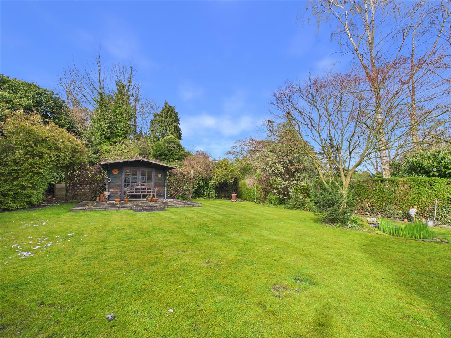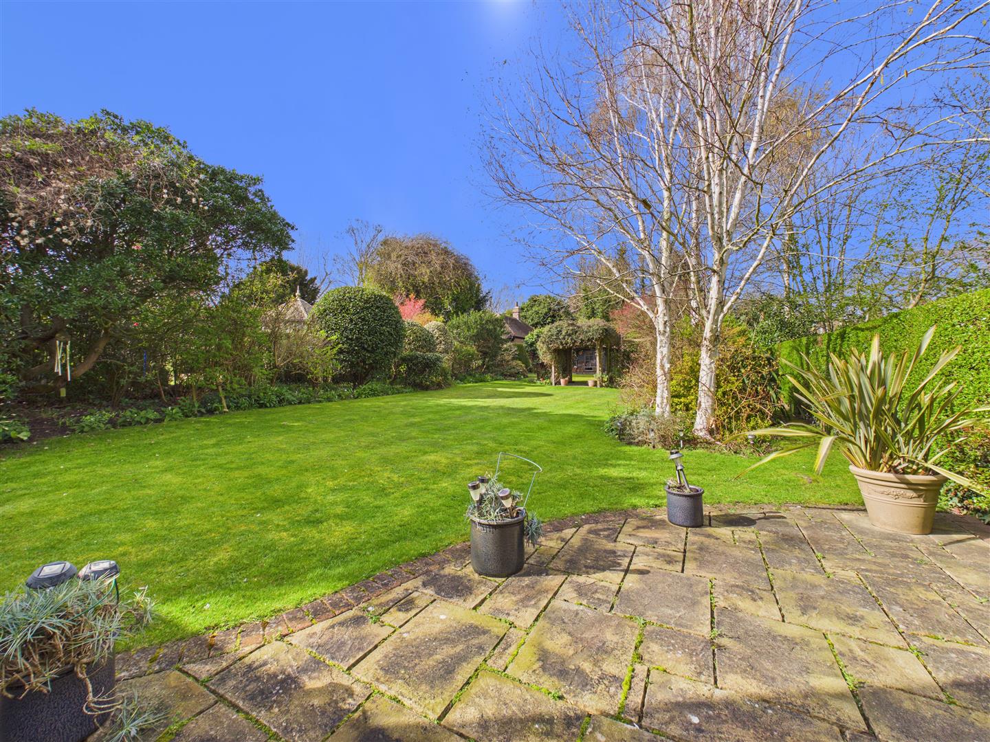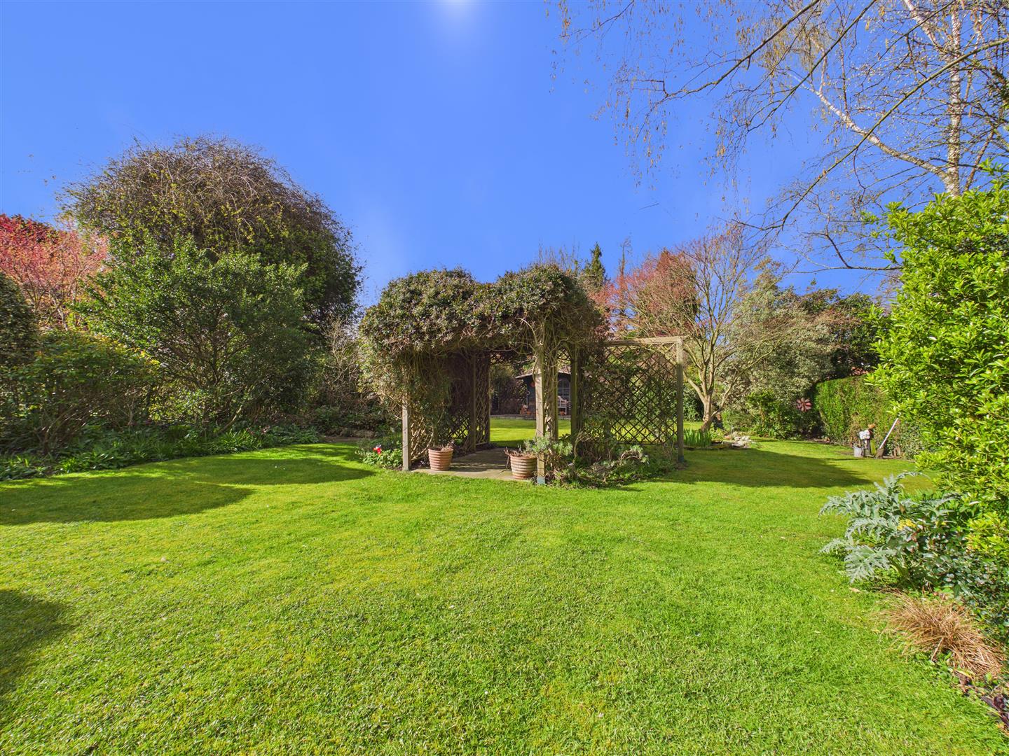 The property sits back from the road behind private wrought-iron gates, with an extensive gravelled forecourt providing parking for several vehicles. The beautifully tended rear garden is a standout feature, offering a high degree of privacy with extensive lawns, mature shrubs, and established trees. A side patio area provides a perfect spot for outdoor dining within this peaceful, protected setting. Early viewing is highly advised.