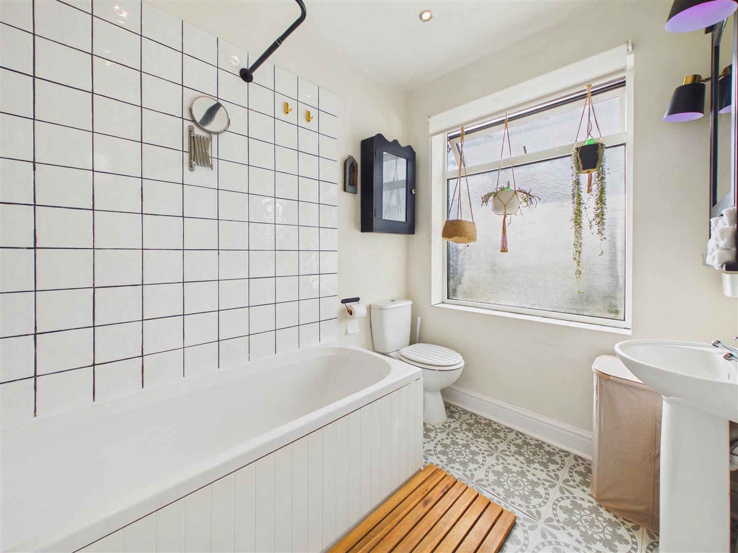 Half-tiled bathroom comprising bath with shower fitting, low-flush W.C., wash-hand basin and window to the rear elevation.