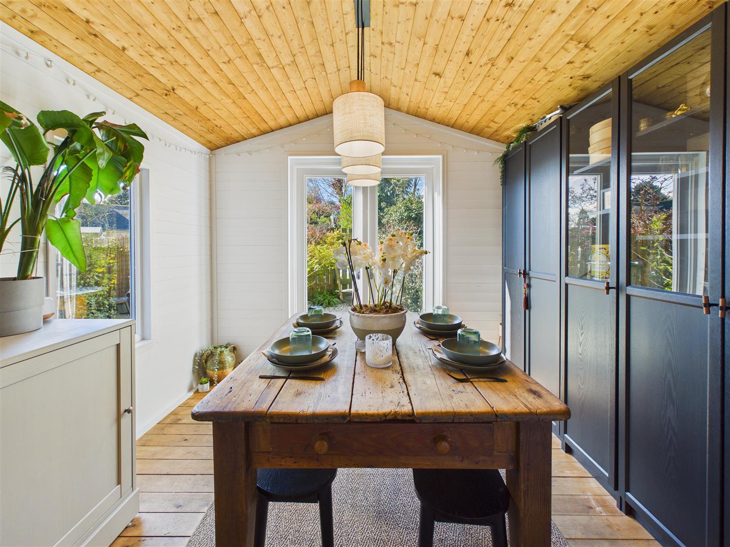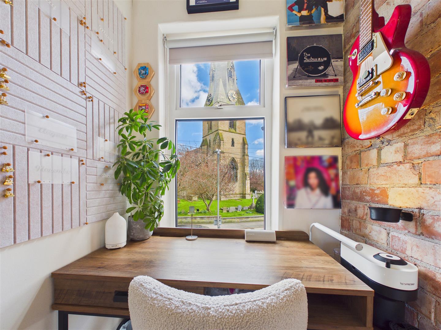 The accommodation opens into an entrance hallway with stairs to the first floor. The lounge features a walk-in bay window and a log-burning stove, leading through to a modern kitchen. To the rear, a garden room provides additional living space with doors opening onto the garden. On the first floor, there are two bedrooms, with the principal bedroom featuring a dedicated study area and views of the church. The accommodation is completed by a modern family bathroom.