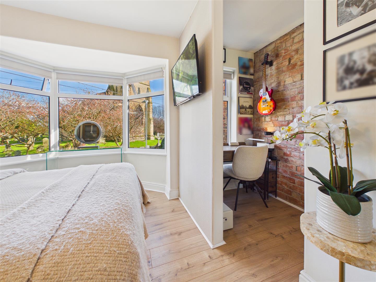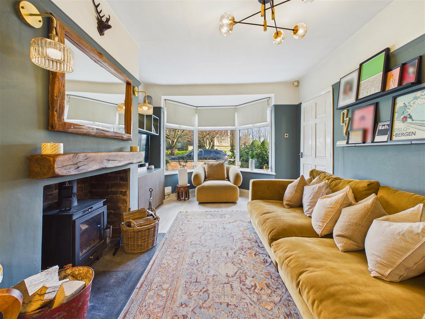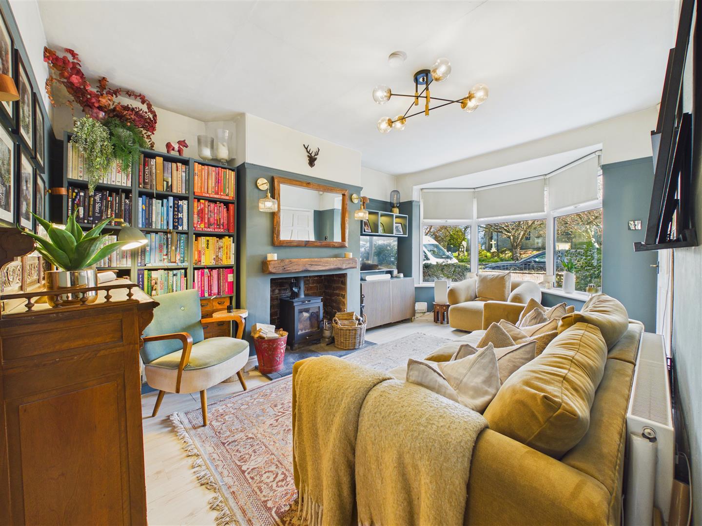 Attractive space with log burning stove upon a slate hearth with oak mantle above. There is a walk in bay window to the front affording views over the church.