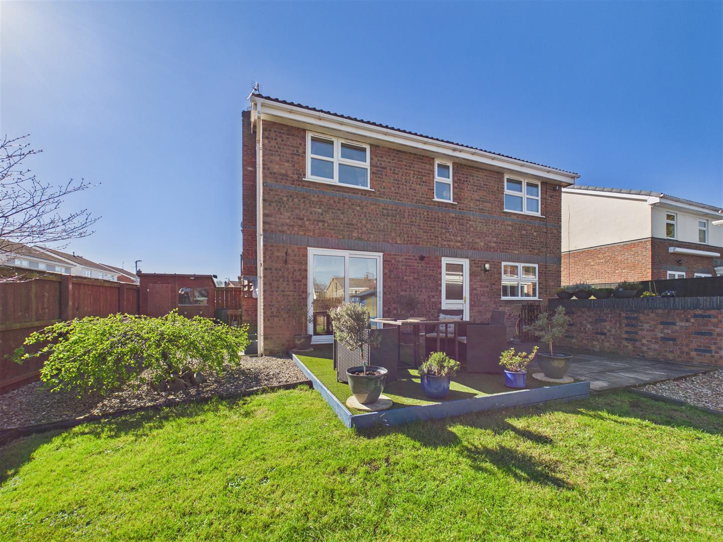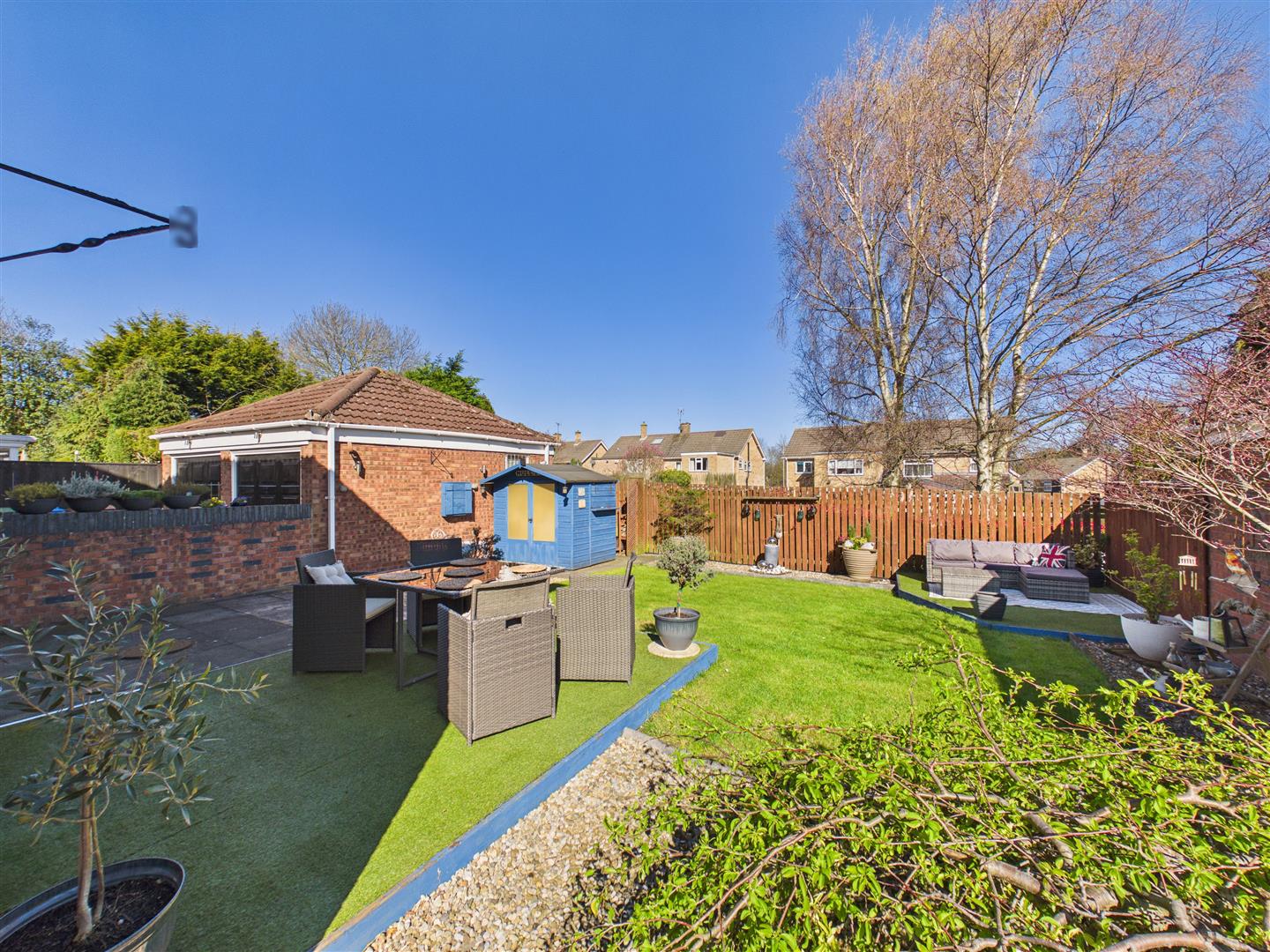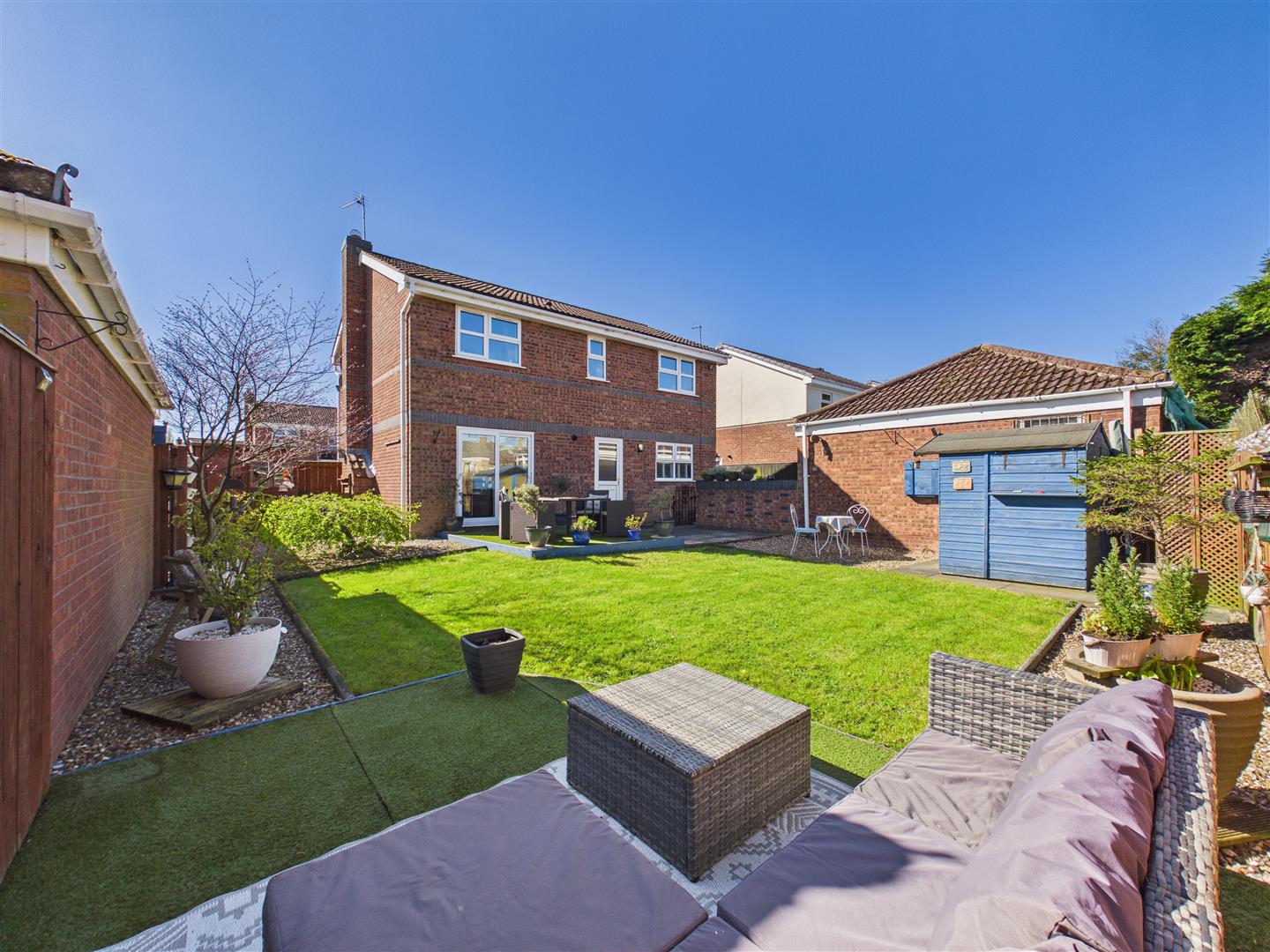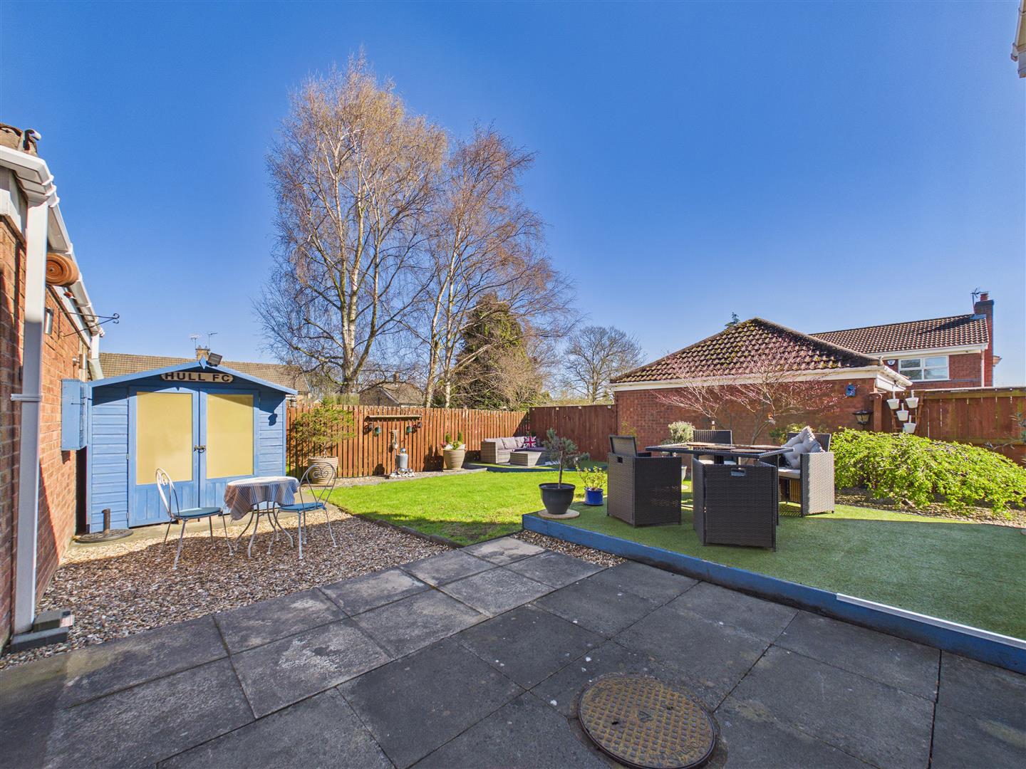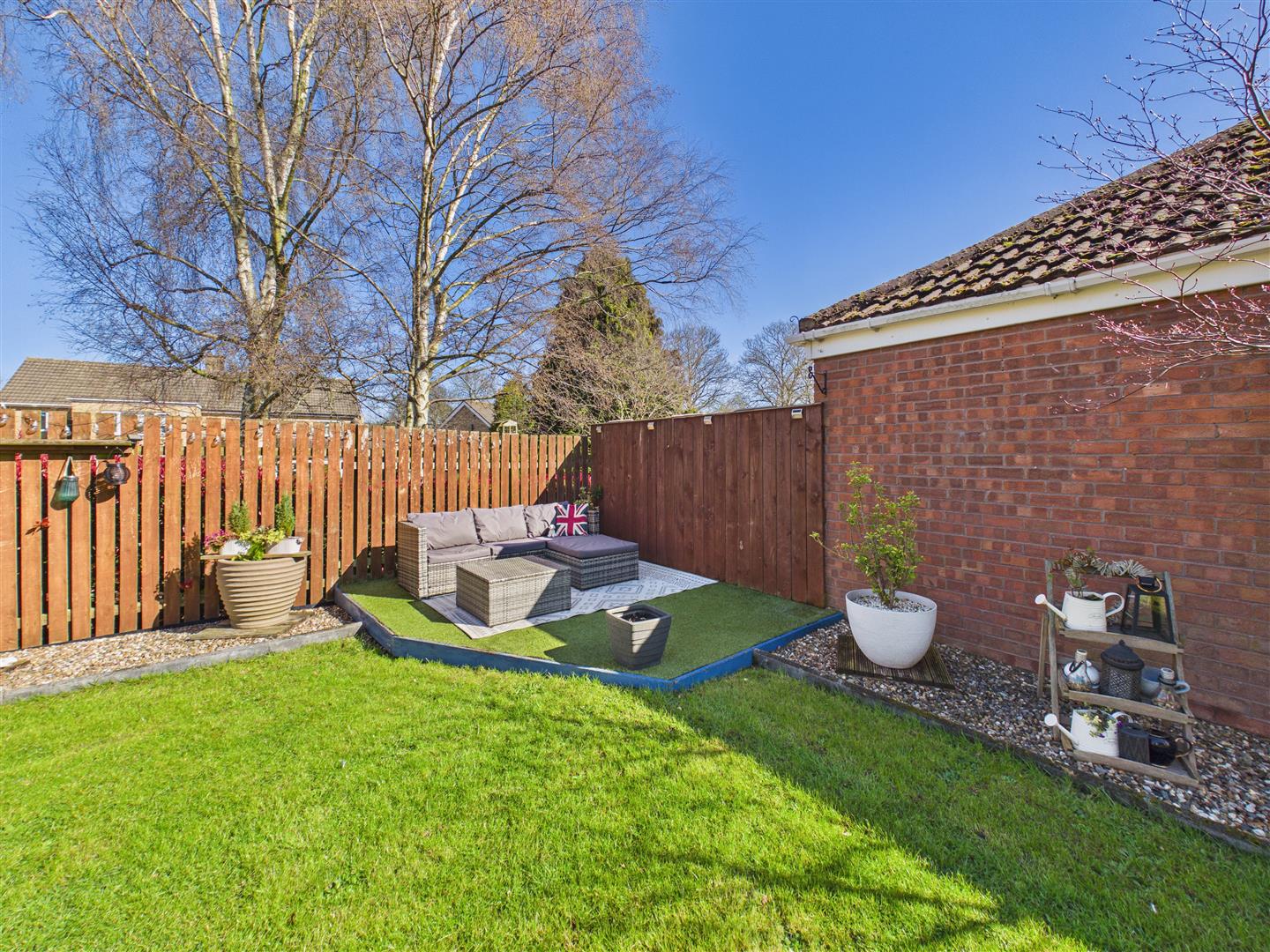 The private rear garden enjoys a sought-after westerly aspect and has been thoughtfully landscaped for both relaxation and easy maintenance. It features a central lawn with attractive gravelled borders, a paved patio, and two timber decks finished with artificial lawn. The garden is fully enclosed by boundary fencing and includes two practical sheds for outdoor storage.