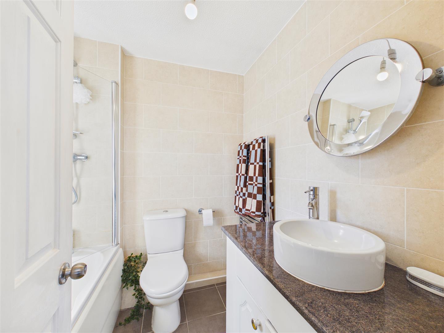 Fully tiled bathroom suite featuring a bath with shower over and screen, wash hand basin and low flush W.C. Heated towel rail and window to rear.