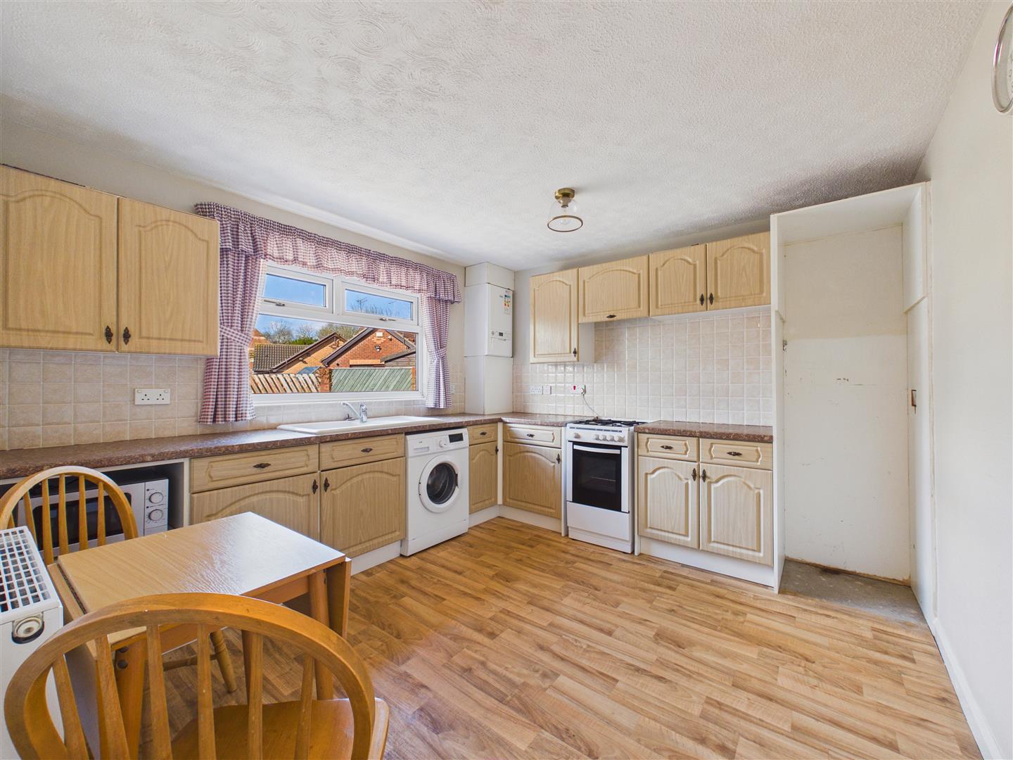 Having a range of fitted base and wall units with laminate worktops incorporating a sink and drainer with mixer tap. There is a cooker point, plumbing for a washing machine and window to the front elevation.