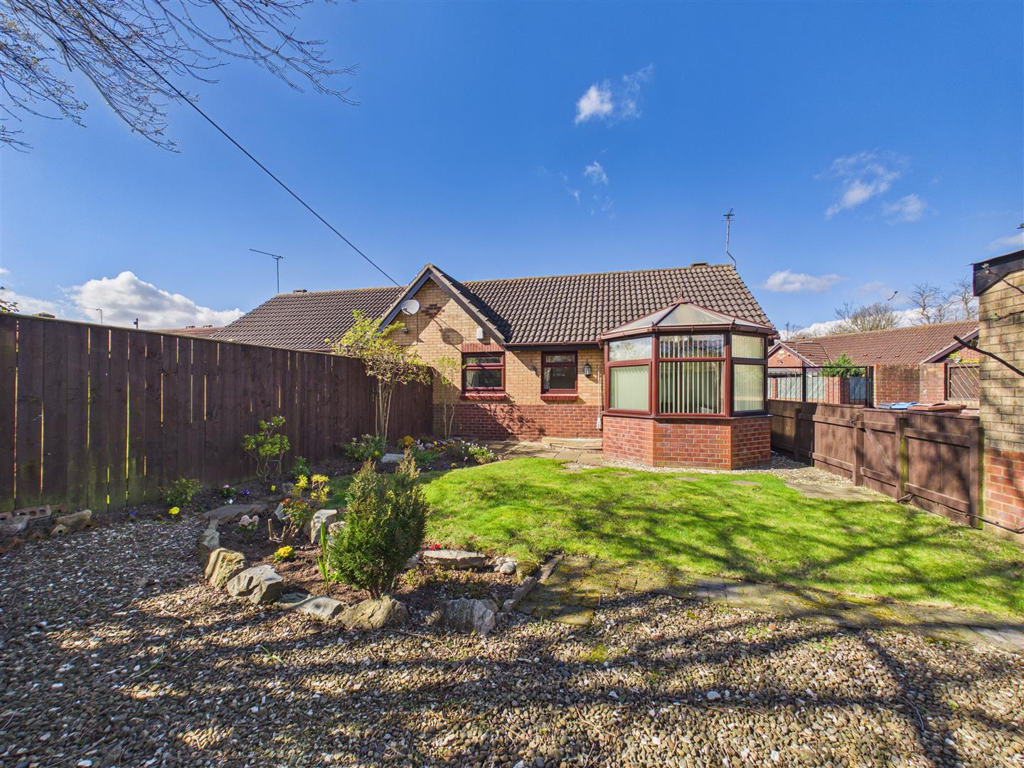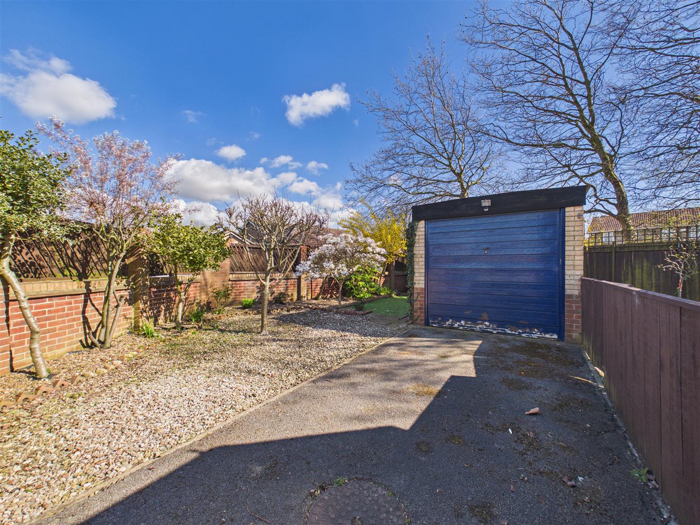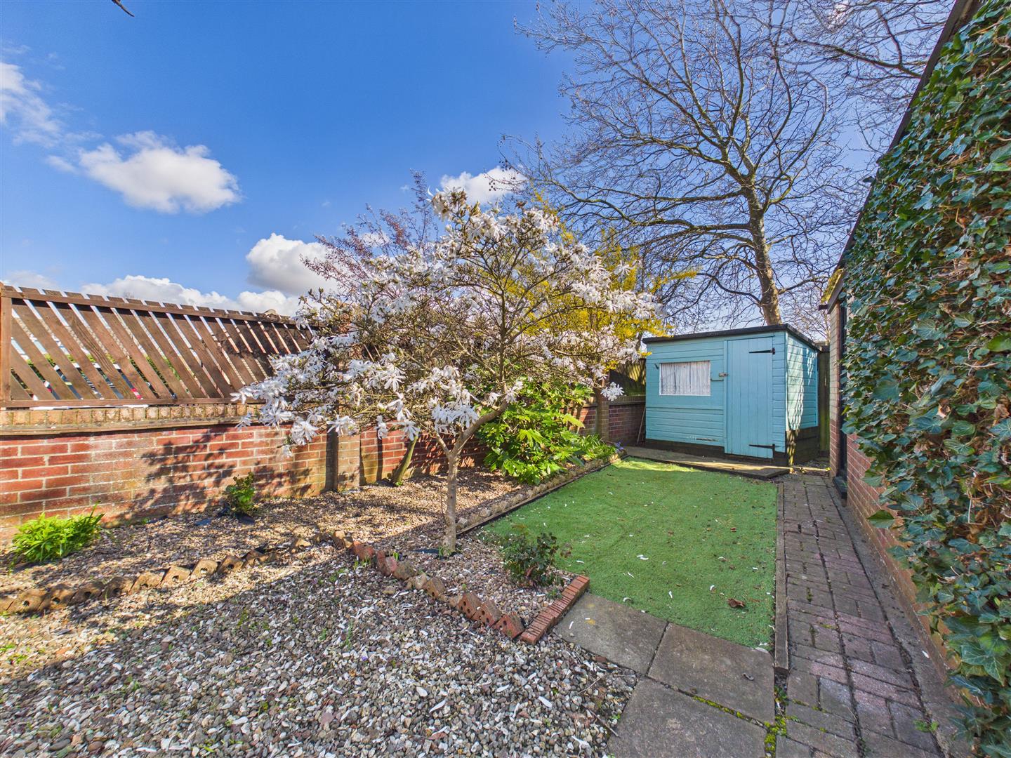 The property stands in a generous plot with a gravelled garden and picket fence to the front. A side driveway leads through wrought iron gates to a detached garage. The outdoor space is divided into two main areas: one side of the garage features an artificial lawn, gravelled areas, and established trees, while the main rear garden enjoys a southerly aspect and is laid to lawn with gravelled and planted borders. A garden shed is also included.