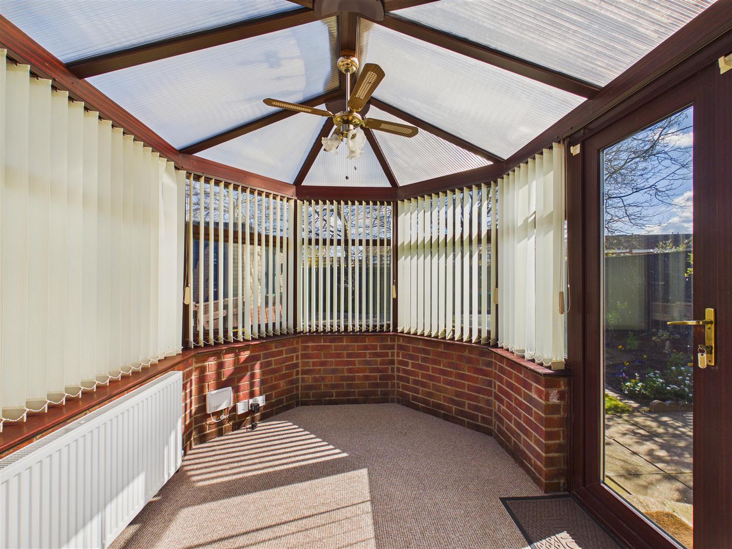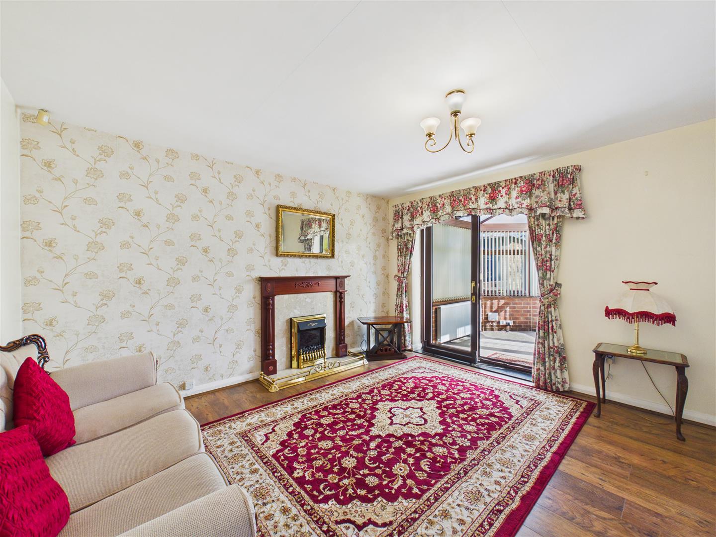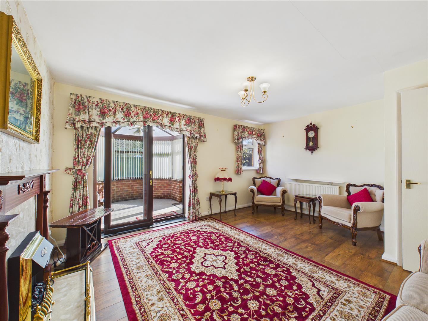 A spacious living area featuring patio doors that lead through to the conservatory. This room currently incorporates the original second bedroom; however, a new owner could easily reinstate the partition should they wish to return the property to a two-bedroom layout.