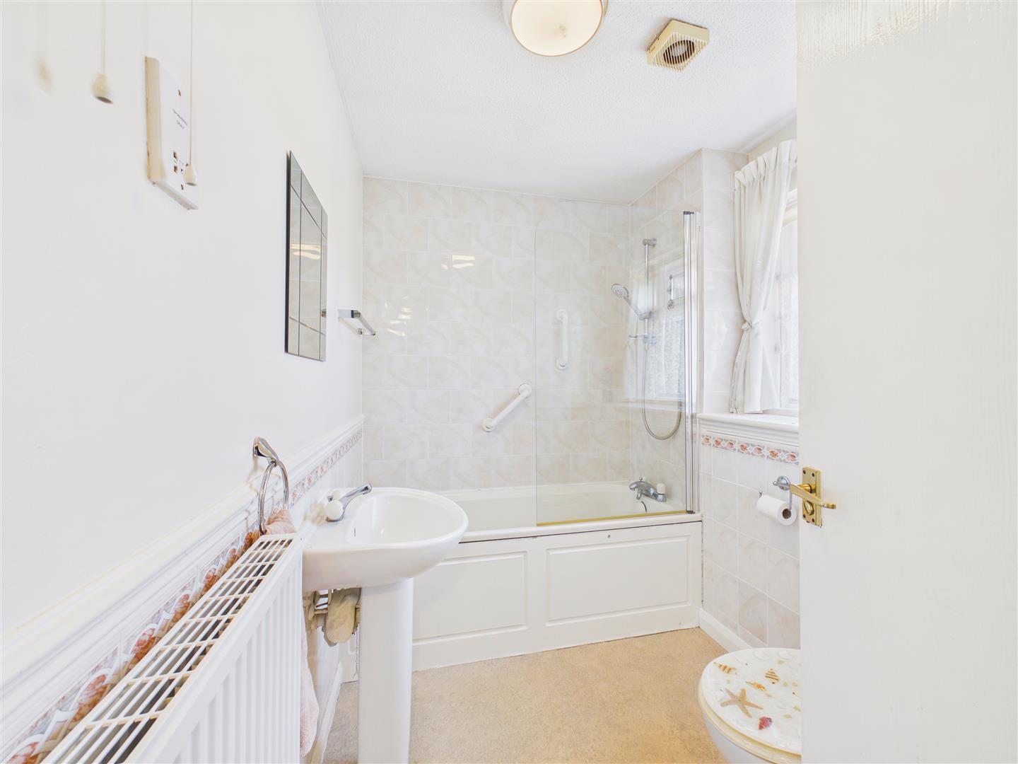 With suite comprising a bath with shower over and screen, wash hand basin and low flush W.C. Part tiling to walls, window to the front elevation.