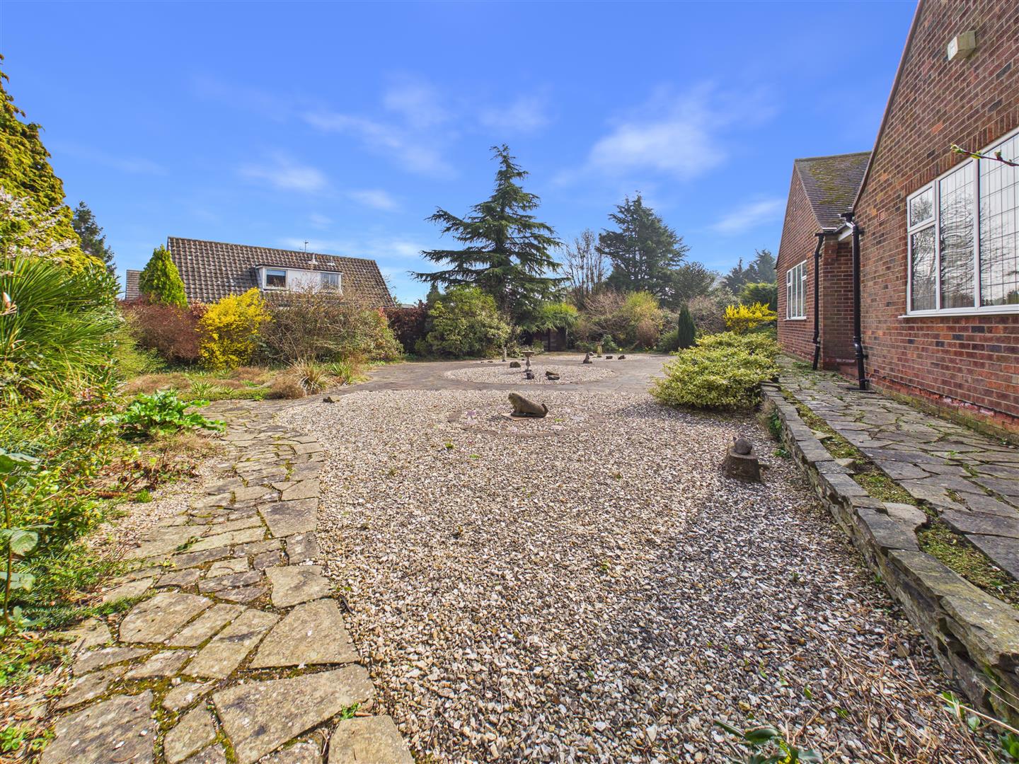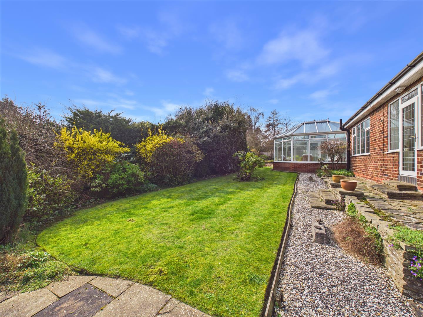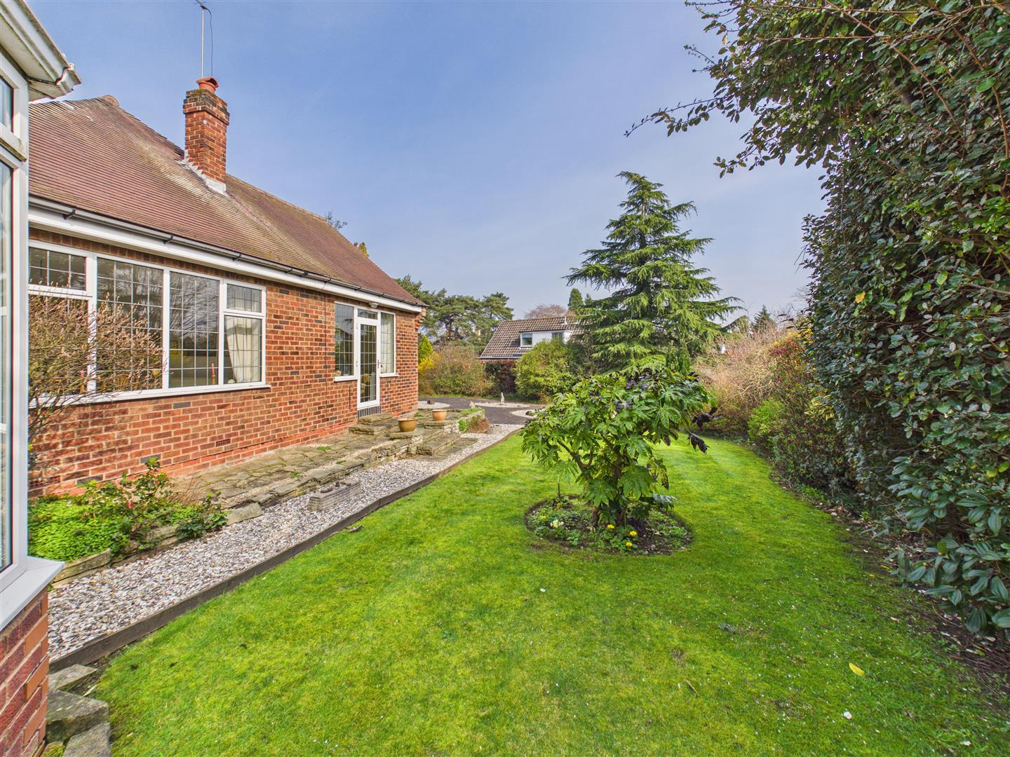 The property occupies an impressive plot of approximately one-third of an acre, with the bungalow positioned centrally to create a sense of space and privacy on all sides. This unique layout provides wraparound gardens that ensure a sunny aspect is available throughout the day.