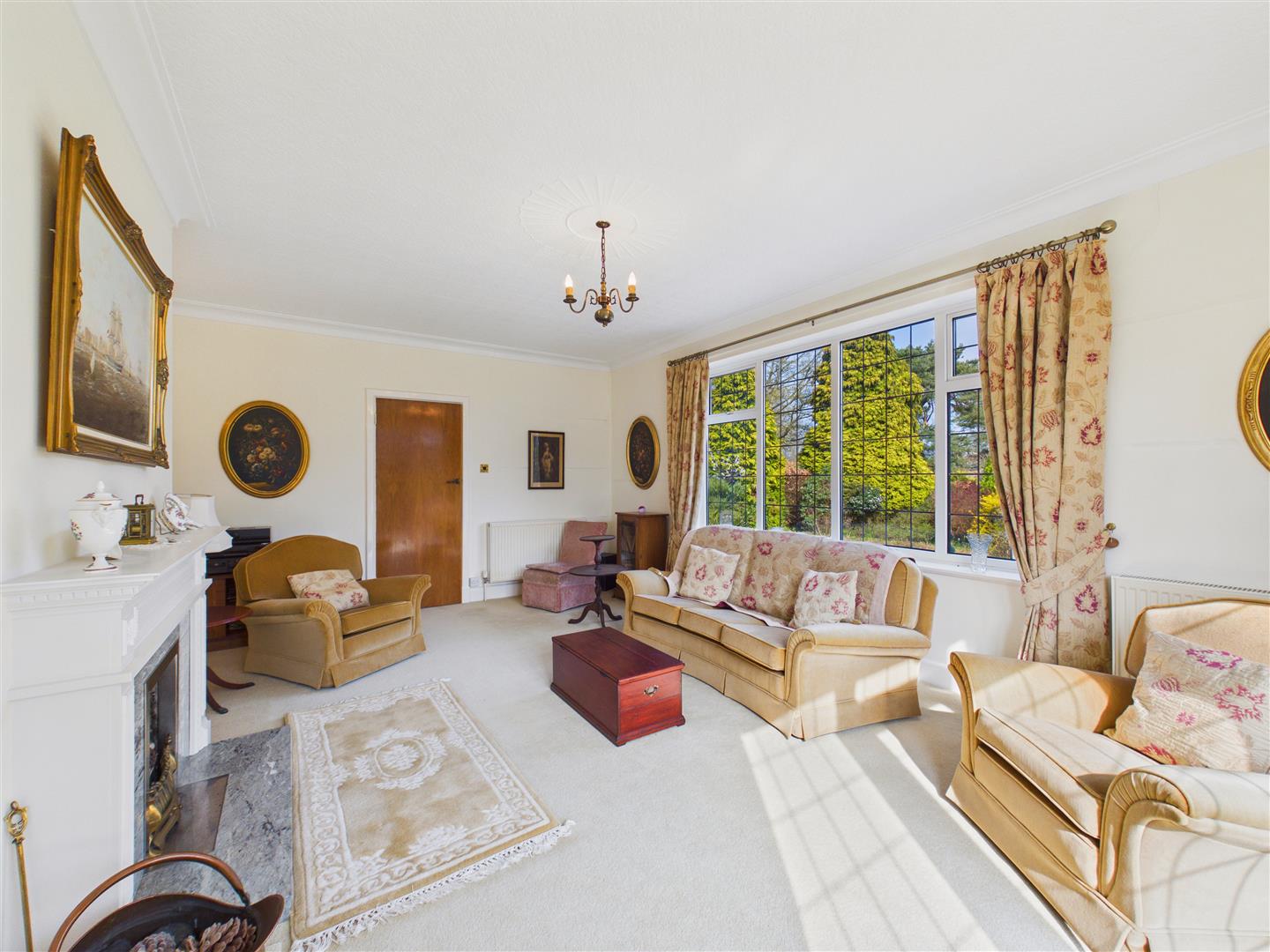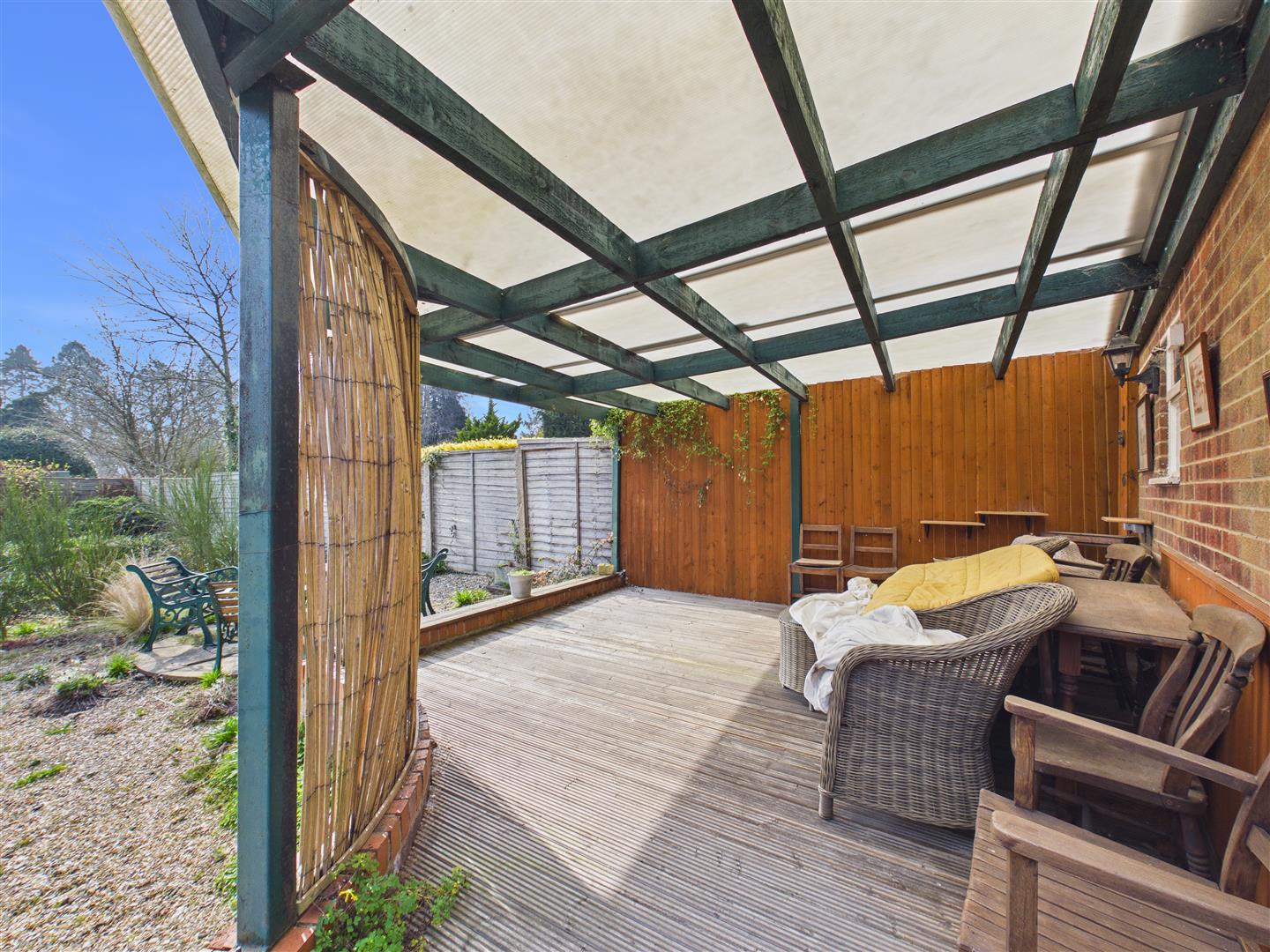 Externally, the bungalow sits centrally within its grounds, featuring wraparound gardens that ensure a sunny aspect is available throughout the day. A private driveway leads to a large garage with an attached covered decked area to the rear. In all, a rare opportunity to acquire a substantial plot in a prime location, ready for refurbishment or ripe for further development.