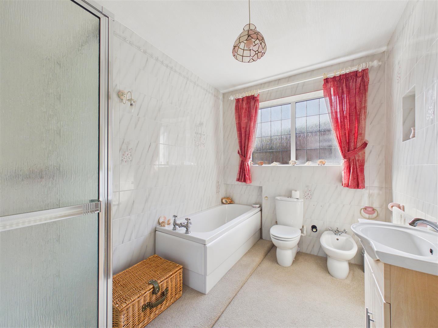 With suite comprising a bath, shower enclosure, wash hand basin and low flush W.C. Window to rear.