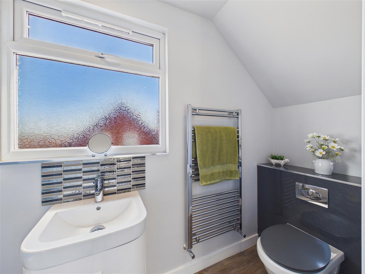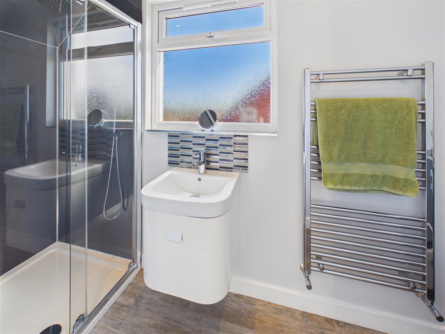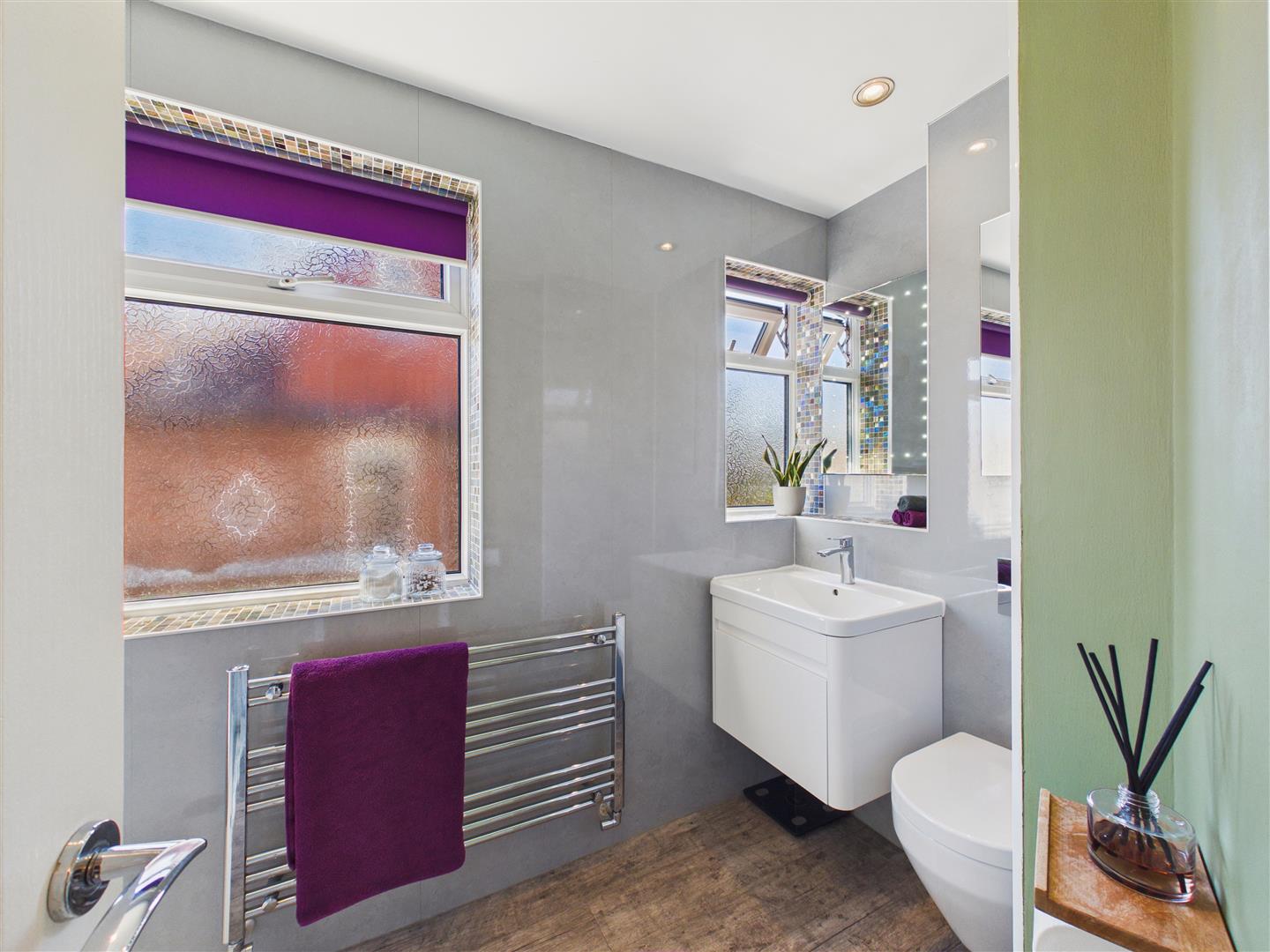 With stylish suite comprising a shower enclosure, vanity unit with wash hand basin and low flush W.C. Window to the side elevation.