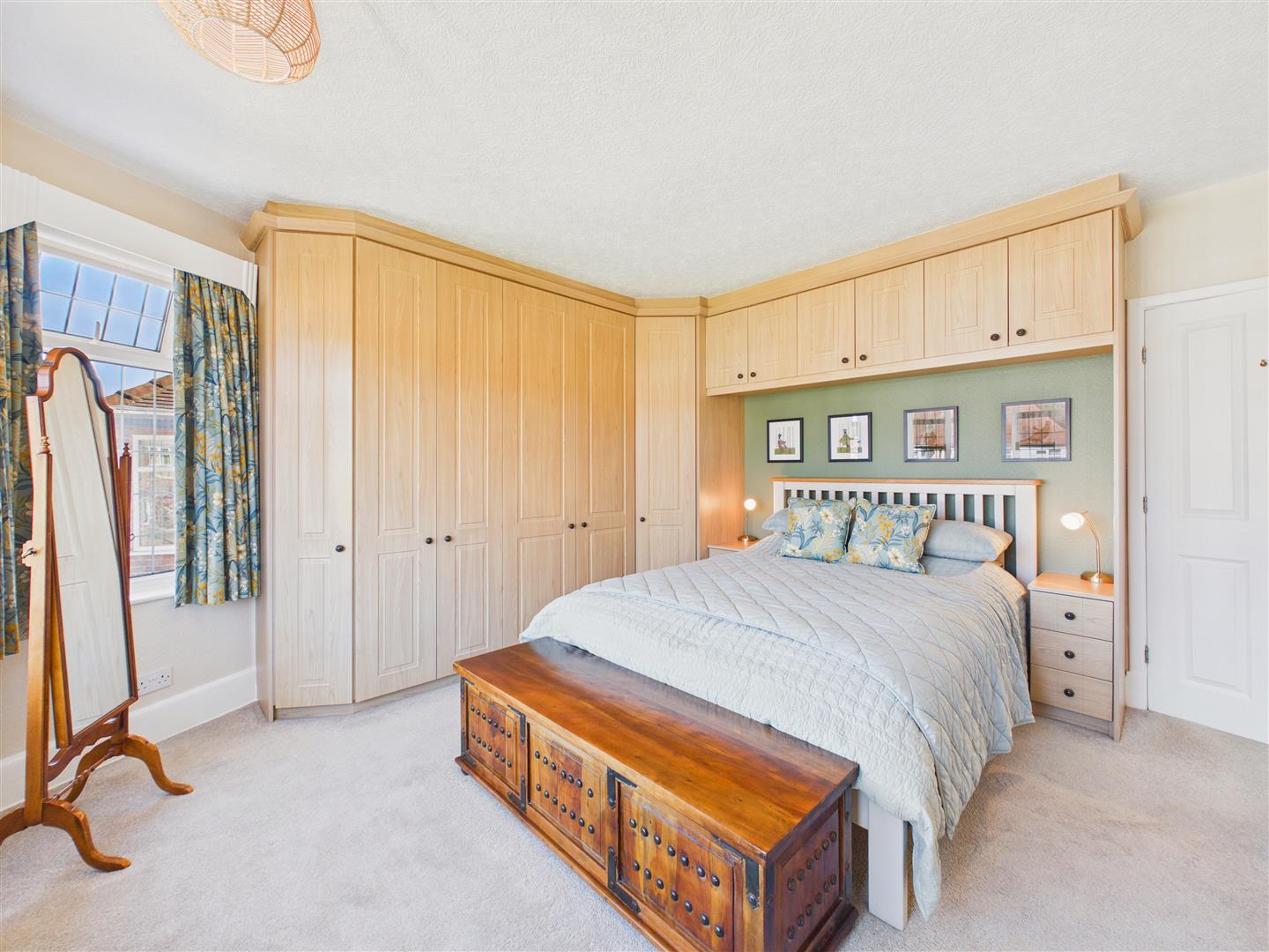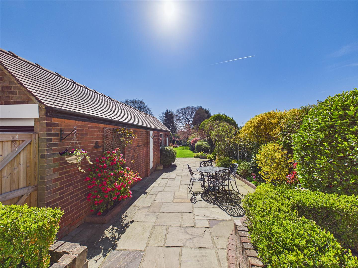 A block-paved driveway provides extensive parking to the front and side, leading to a detached tandem-length garage with a roller door. A standout feature of the home is the south-facing rear garden, which enjoys a sunny aspect throughout the day. A large patio area directly adjoins the house, offering an ideal space for entertaining, and overlooks an immaculately manicured lawn with established shrub borders. Practicality is further enhanced by a coal house and potting shed located to the rear of the garage.