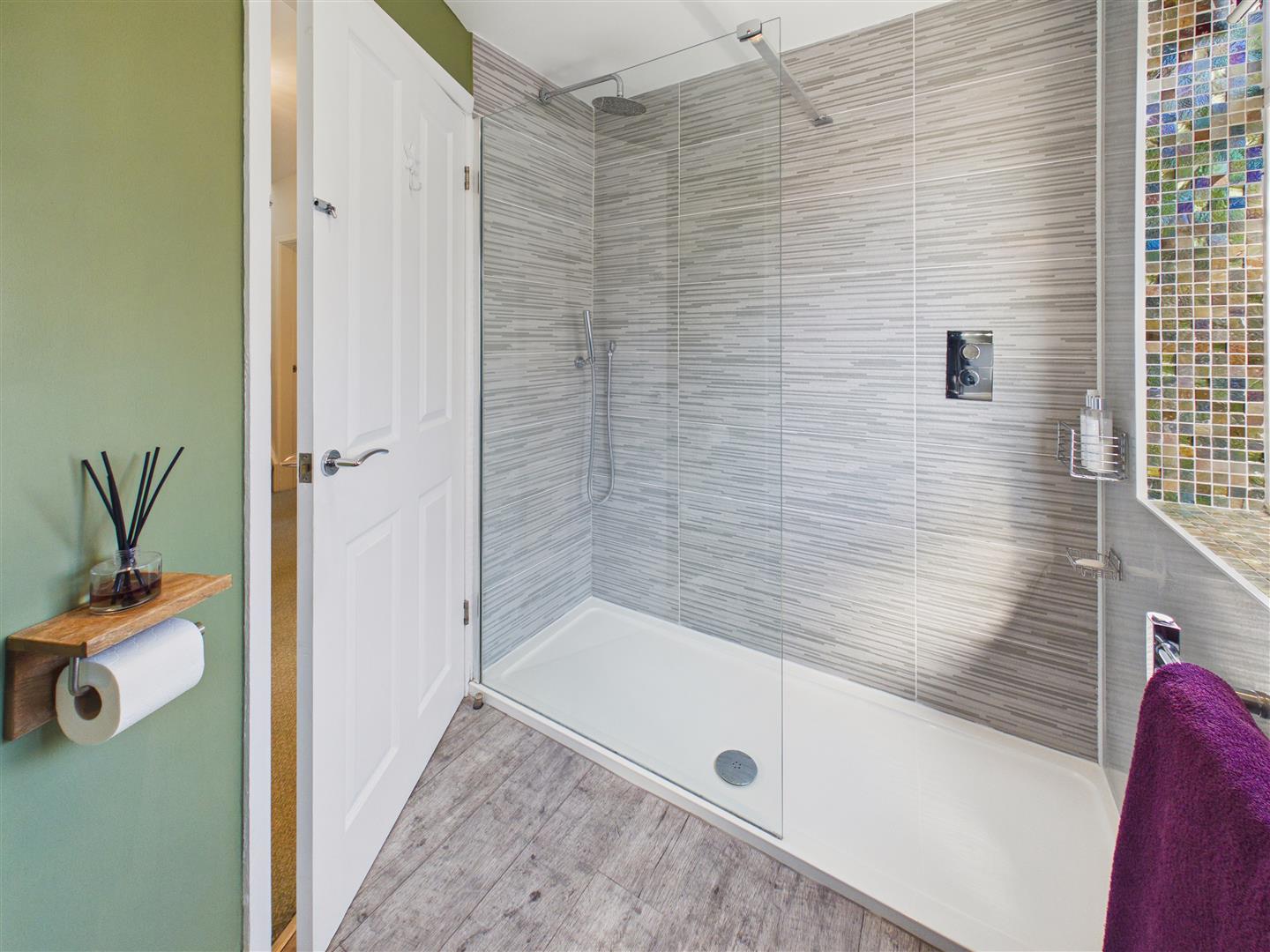 With modern suite comprising a walk in shower, vanity unit with wash hand basin and low flush W.C. Tiling and panelling to walls, inset spot lights, heated towel rail and window to side.