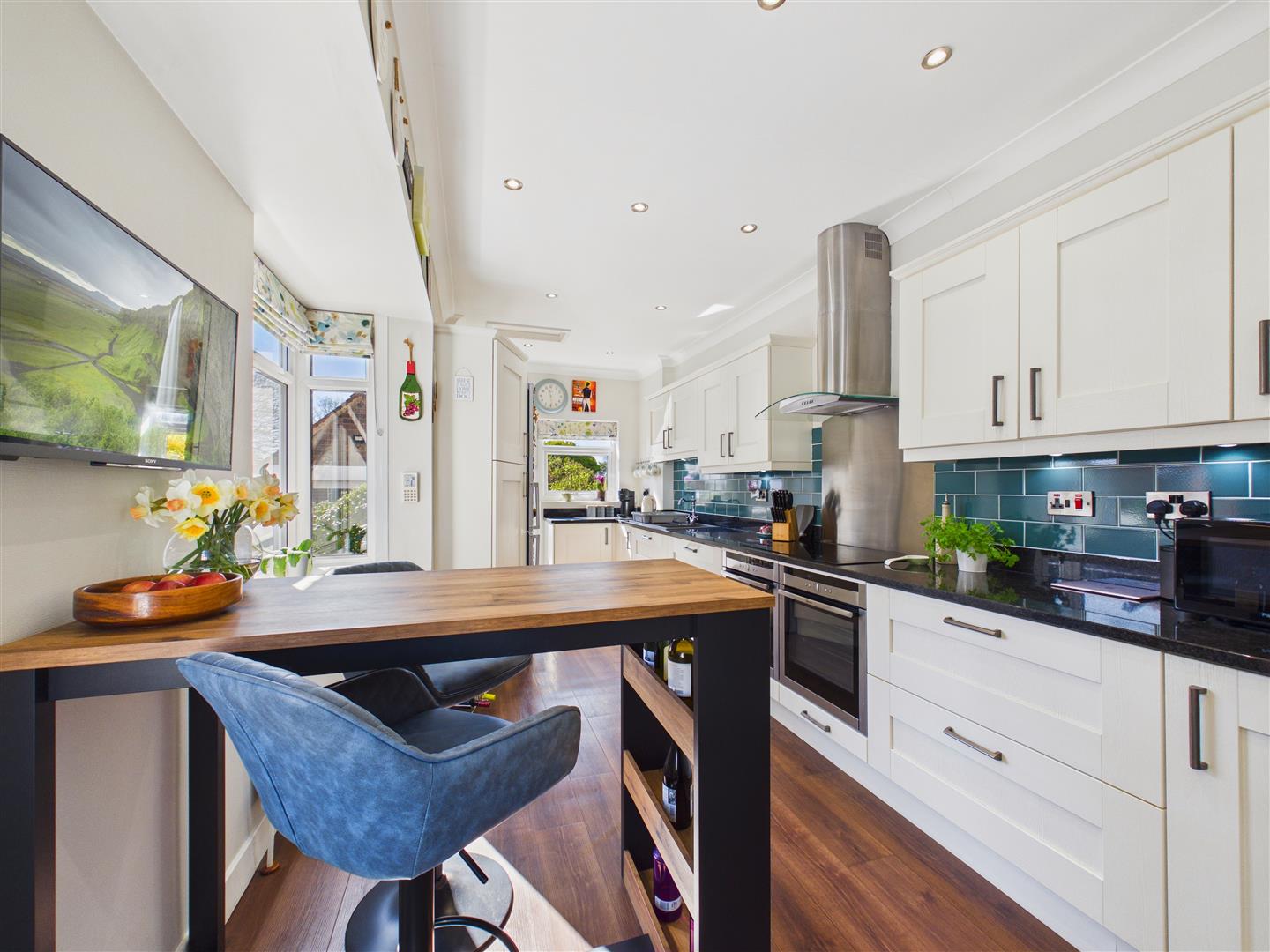 Having a range of modern base and wall units with granite worktops incorporating a one and a half bowl sink and drainer with mixer tap, two ovens/grills, five ring induction hob with filter above, integrated washing machine, housing for a fridge/freezer and ample space for a dining table and chairs. Windows to the side and rear. External access door to rear.