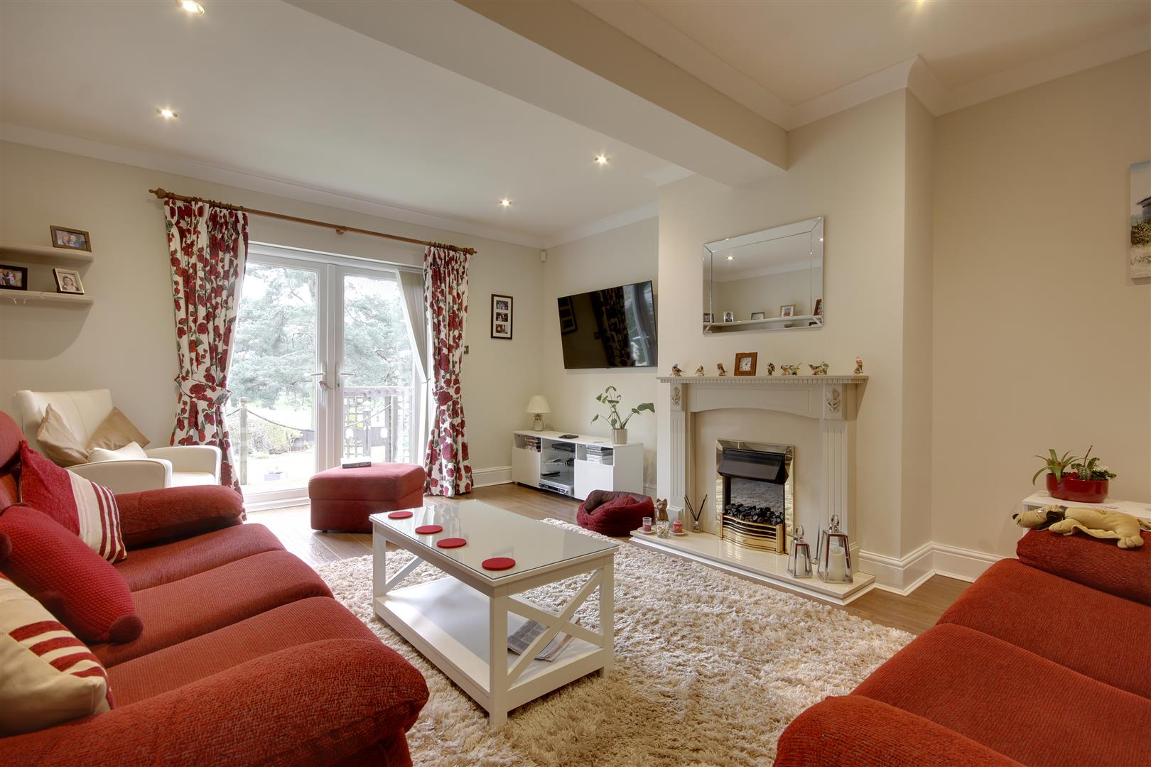 A lovely room with feature fire surround housing an electric fire and double doors opening out to the rear decked balcony providing views across the garden and beyond.