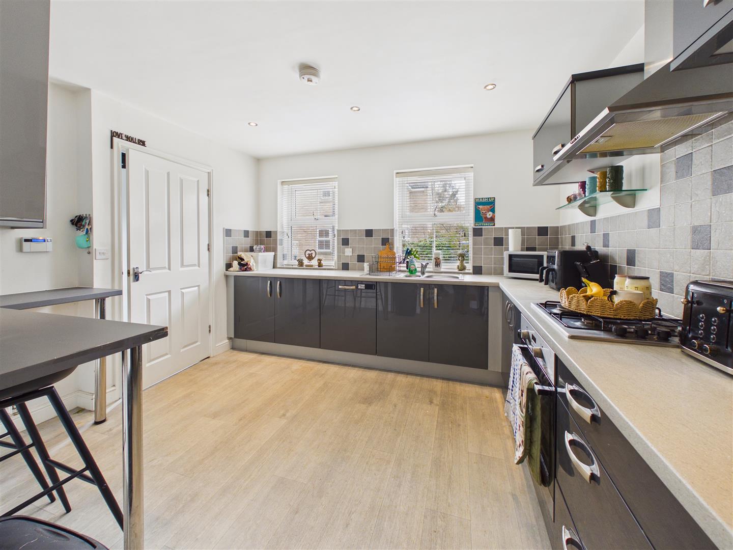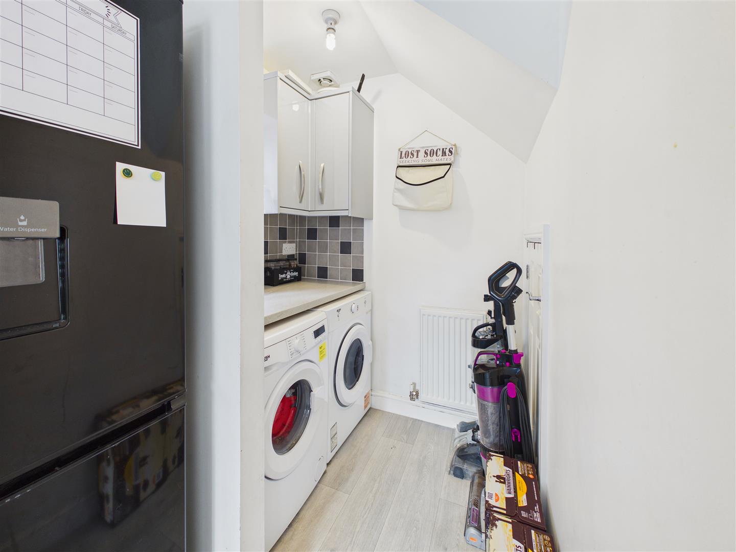 Having a range of contemporary gloss base and wall units with contrasting worksurfaces, tiled splashbacks, one and a half sink and drainer, oven, four ring gas hob with filter hood above. There is space for a fridge/freezer and a fitted breakfast bar. The utility area has plumbing for a washing machine, space for a tumble dryer and there is a useful understairs storage cupboard.