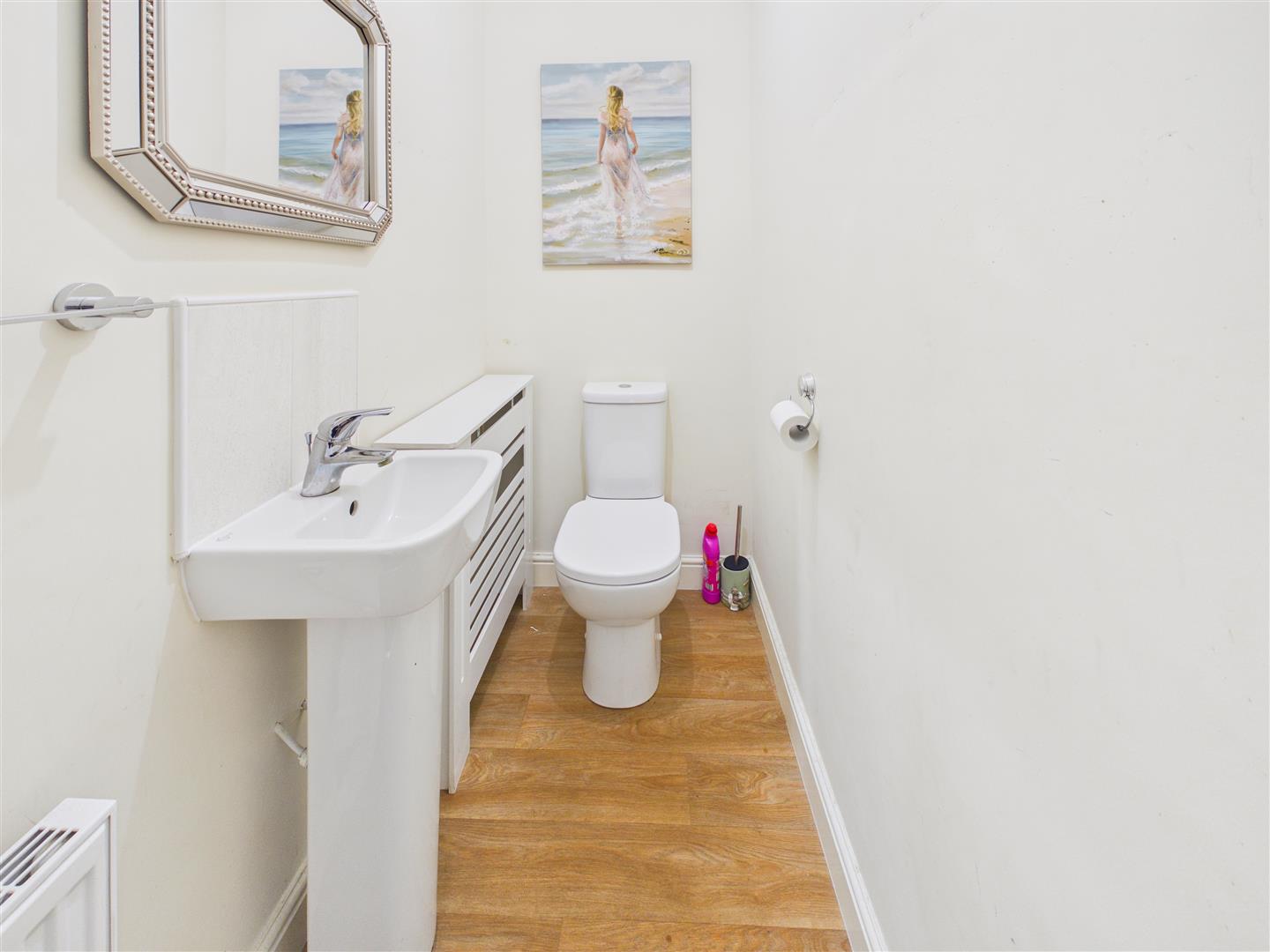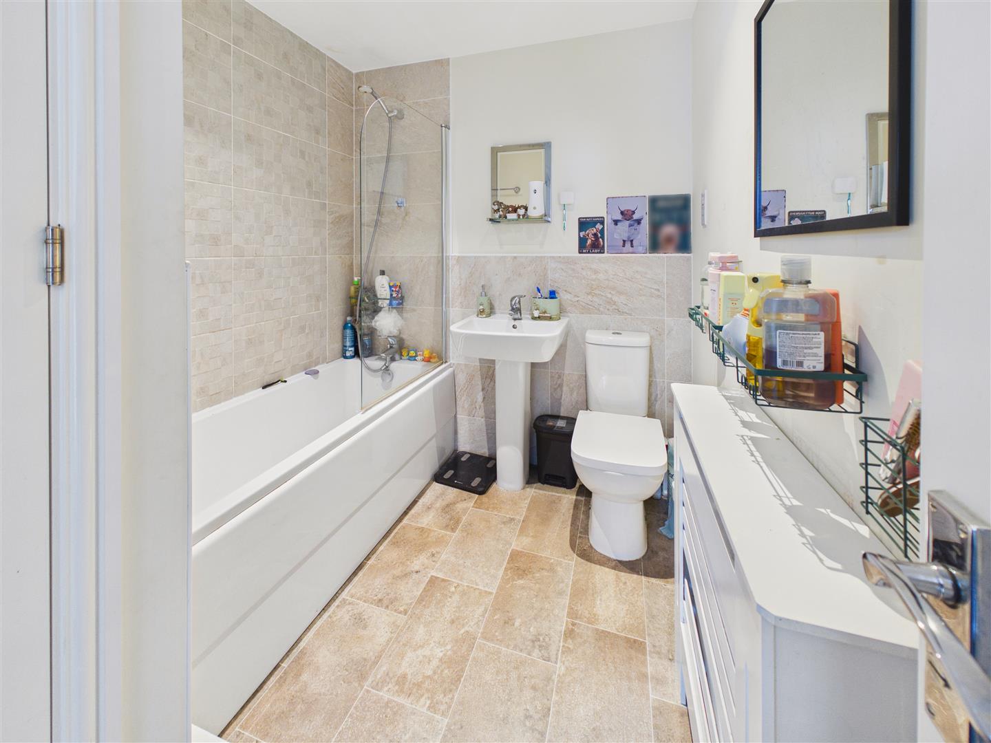 With modern suite comprising a bath with shower over and screen, pedestal wash hand basin and low flush W.C. Part tiling to walls and inset spot lights. There is an airing cupboard housing the gas central heating boiler.