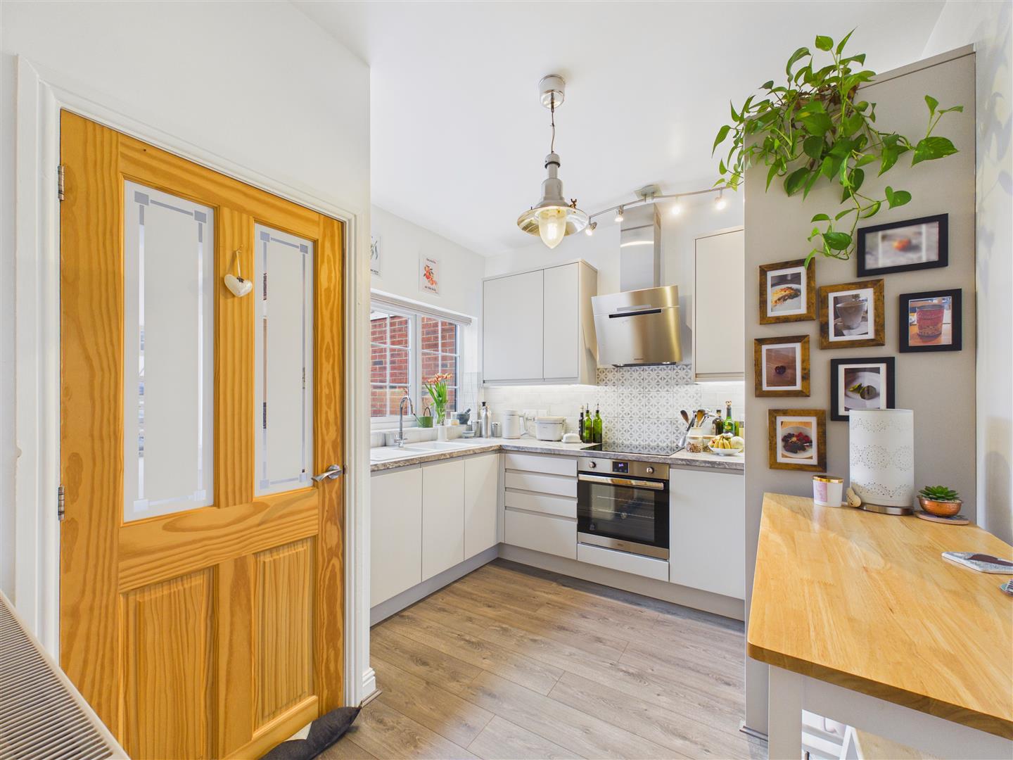 With stylish units and laminate worktops incorporating a one and a half bowl sink and drainer with mixer tap, oven, four ring hob with filter above, fridge/freezer and washer/dryer. There is a useful understairs storage cupboard and window to rear.