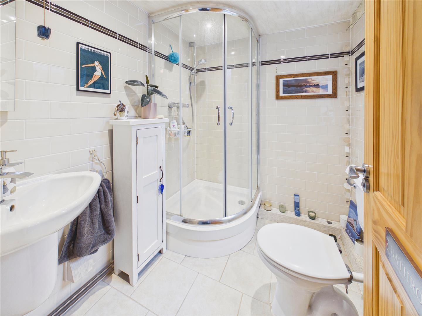 With modern suite comprising a shower enclosure, wash hand basin and low flush W.C. Window to side.