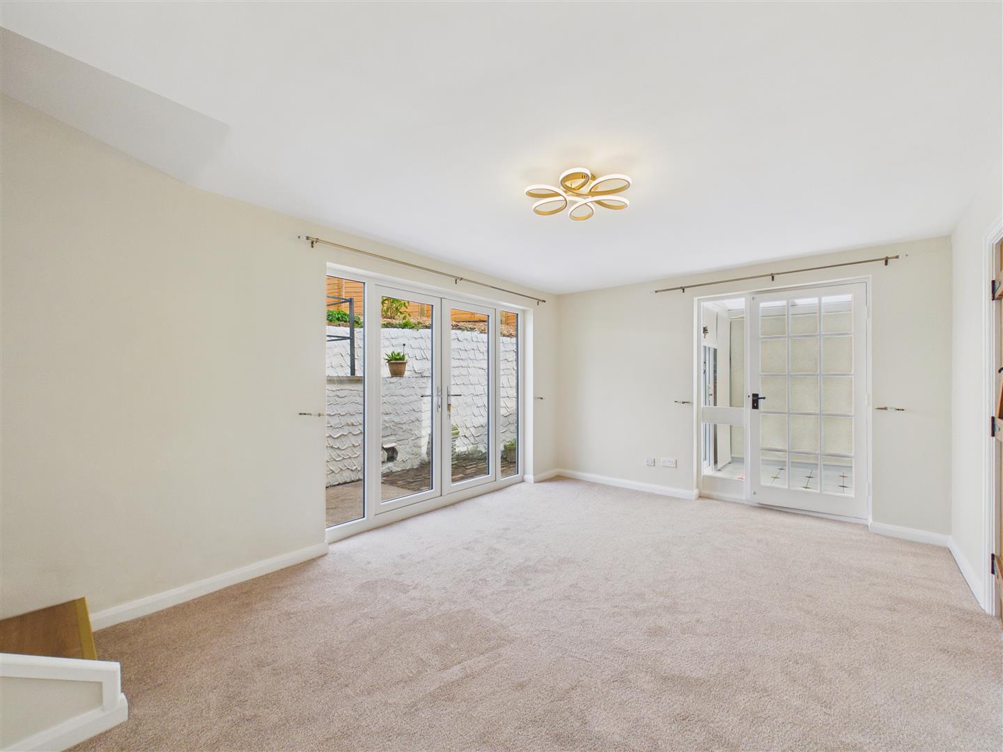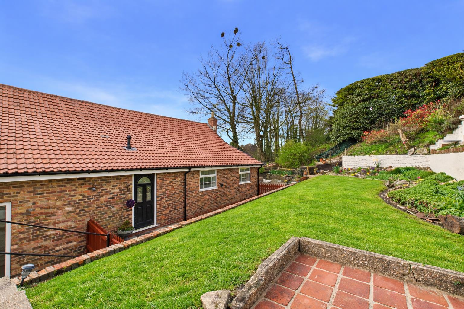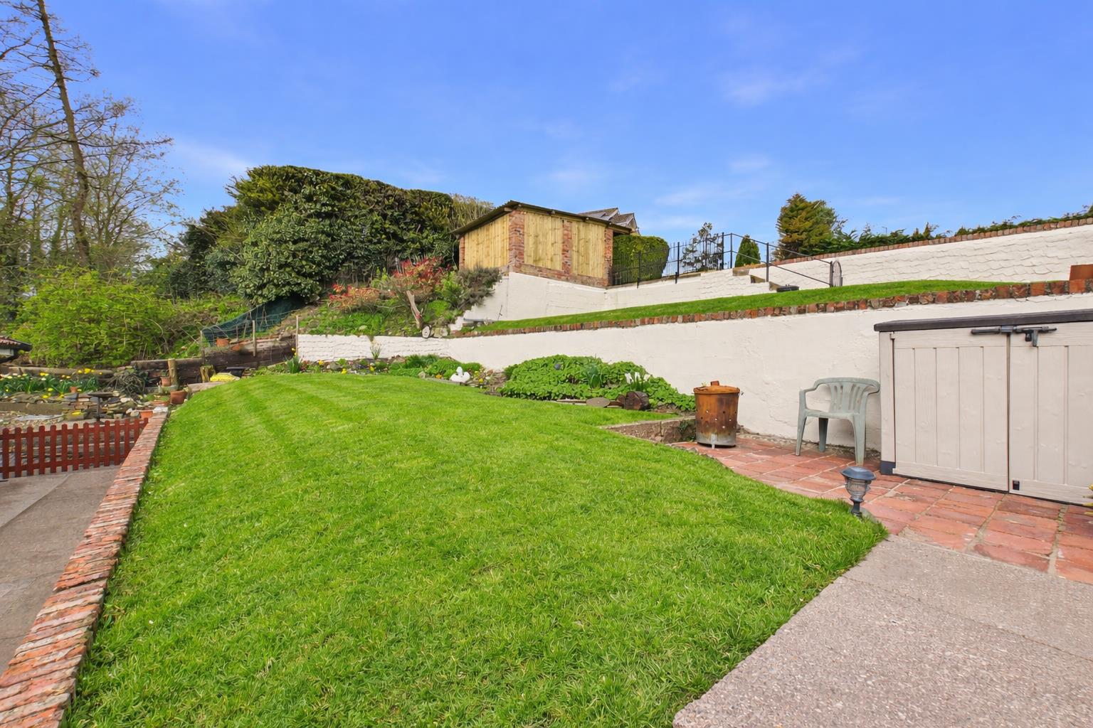 Occupying a prominent elevated position, the property offers gated side access leading to the rear. The gardens are a particular highlight, thoughtfully arranged over several levels with an extensive lawn and a dedicated sun terrace. Privacy is a key feature here, with the garden fully enclosed by fencing and bordered by adjacent woodland, providing a tranquil, natural backdrop.