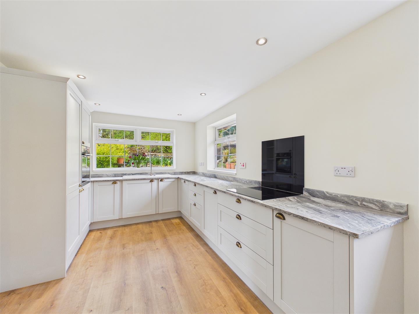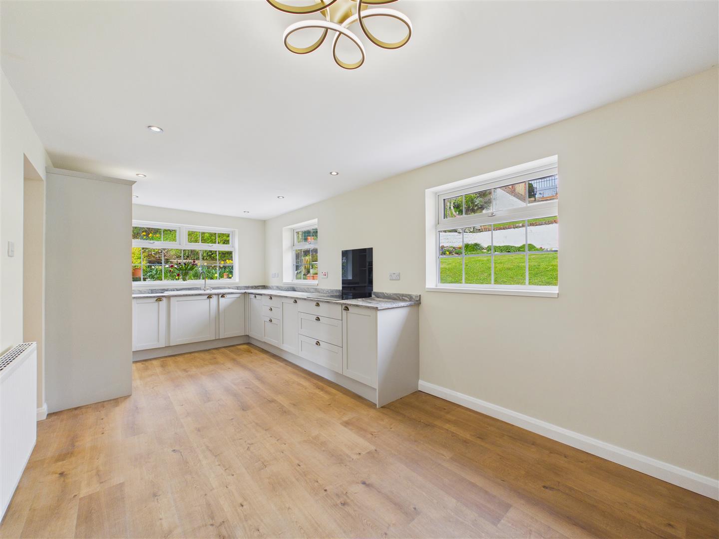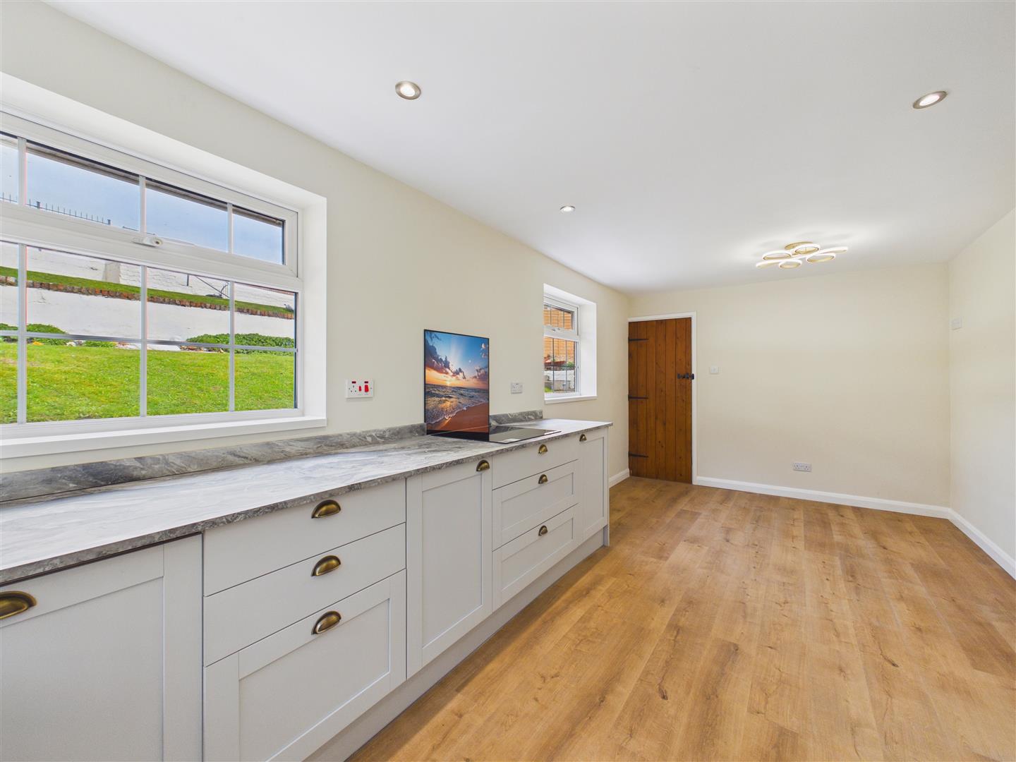 This Howdens kitchen features a range of fitted base and wall units with complementing worktops incorporating a ceramic sink and drainer, NEFF oven with hide and slide door, ceramic hob, fridge/freezer and dishwasher. Wall mounted TV point and sockets plus further sockets with USB points. Windows to the front and side. There is also ample space for dining/living.