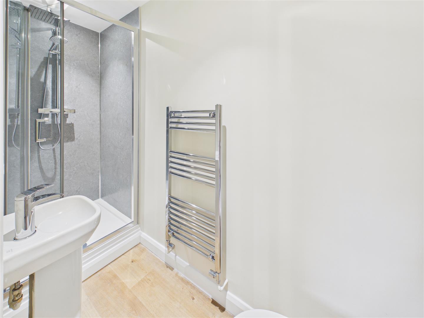 With Roca suite comprising a shower enclosure, wash hand basin and low flush W.C.