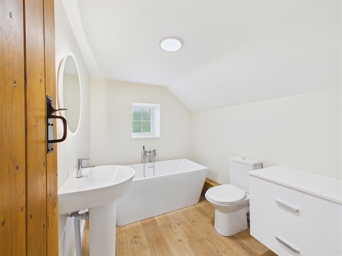 With Roca suite comprising a free standing bath with shower attachment, wash hand basin and low flush W.C. Fitted cabinet, lit mirror and window to the side elevation.