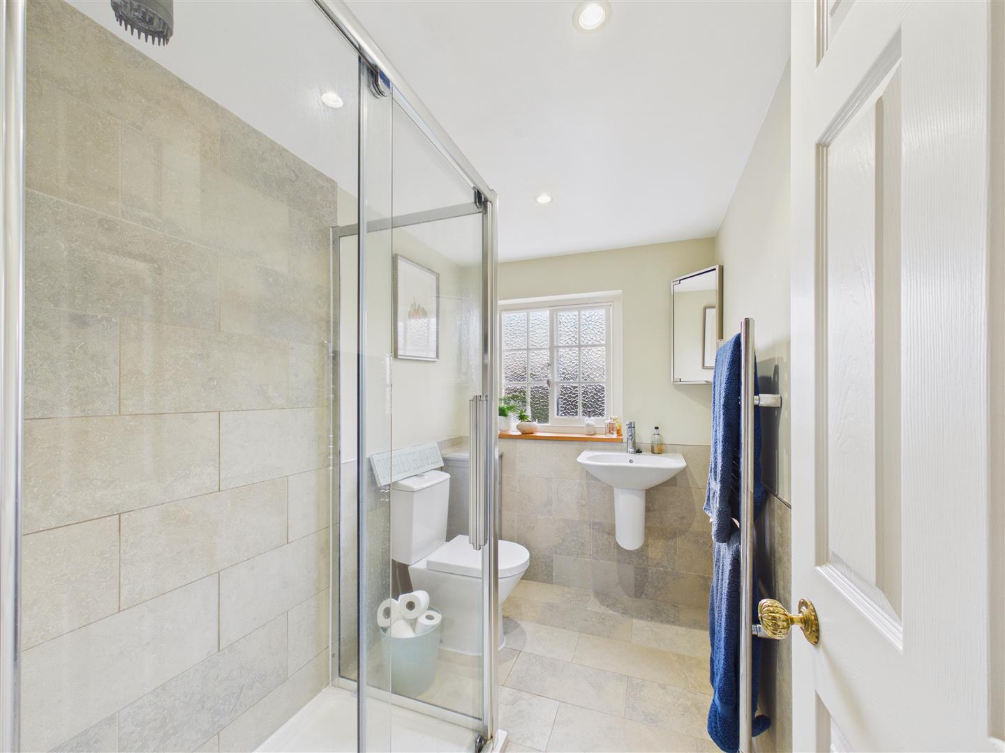 With modern suite comprising a shower enclosure, wash hand basin and low flush W.C. Heated towel rail and window to rear.