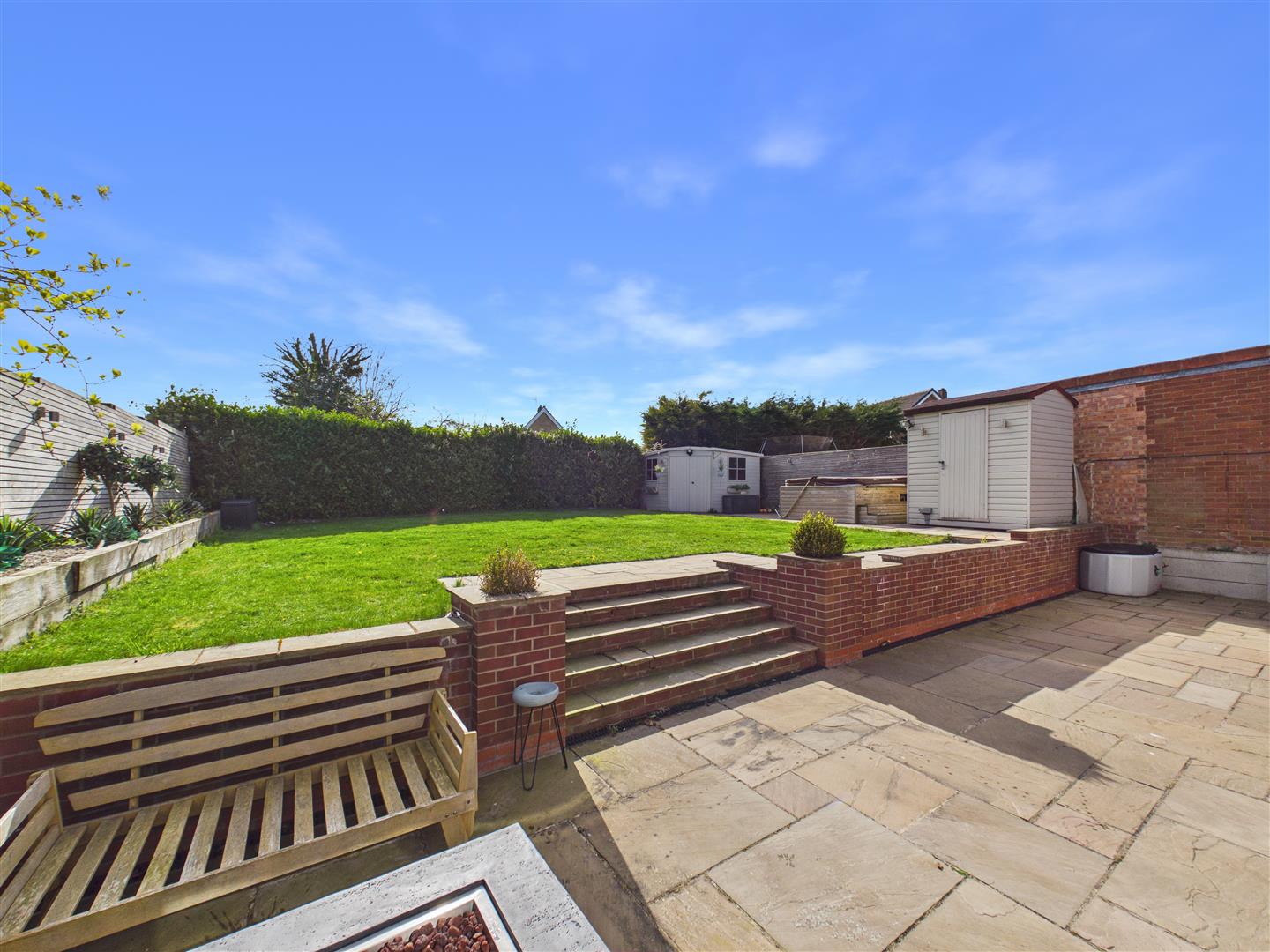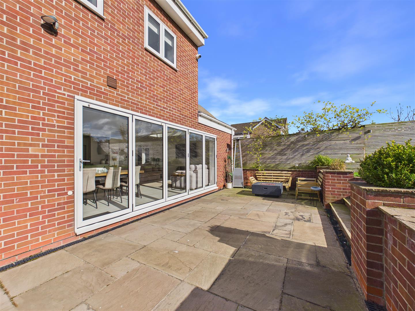 The exterior is designed for a modern lifestyle. A block-paved driveway provides ample off-street parking and leads to a single garage, currently utilized as a home gym. The south-westerly facing rear garden is a private sun-trap, featuring a patio directly adjoining the bi-fold doors for seamless indoor-outdoor living. Steps lead up to a neat lawn and a further terrace—an ideal leisure spot complete with a hot tub and a convenient outdoor W.C.