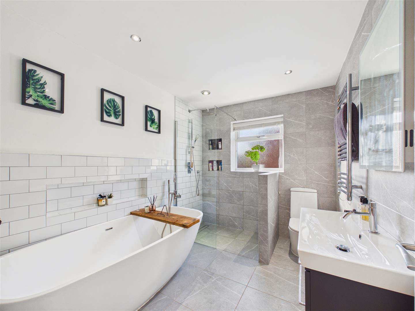 Fitted with a luxurious suite comprising a deep bath with freestanding tap and shower attachment, walk in shower, vanity unit with wash hand basin and low flush W.C. Heated towel rail, tiling to floor part tiling to walls, and window to side.
