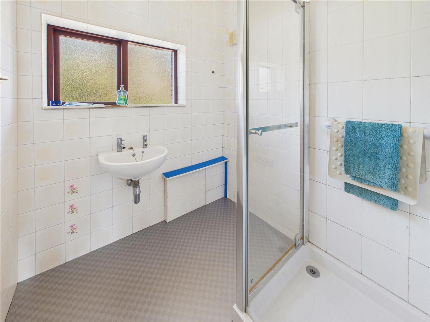 Half-tiled shower room, comprising a shower enclosure to corner and wash-hand basin beneath window to the front elevation.