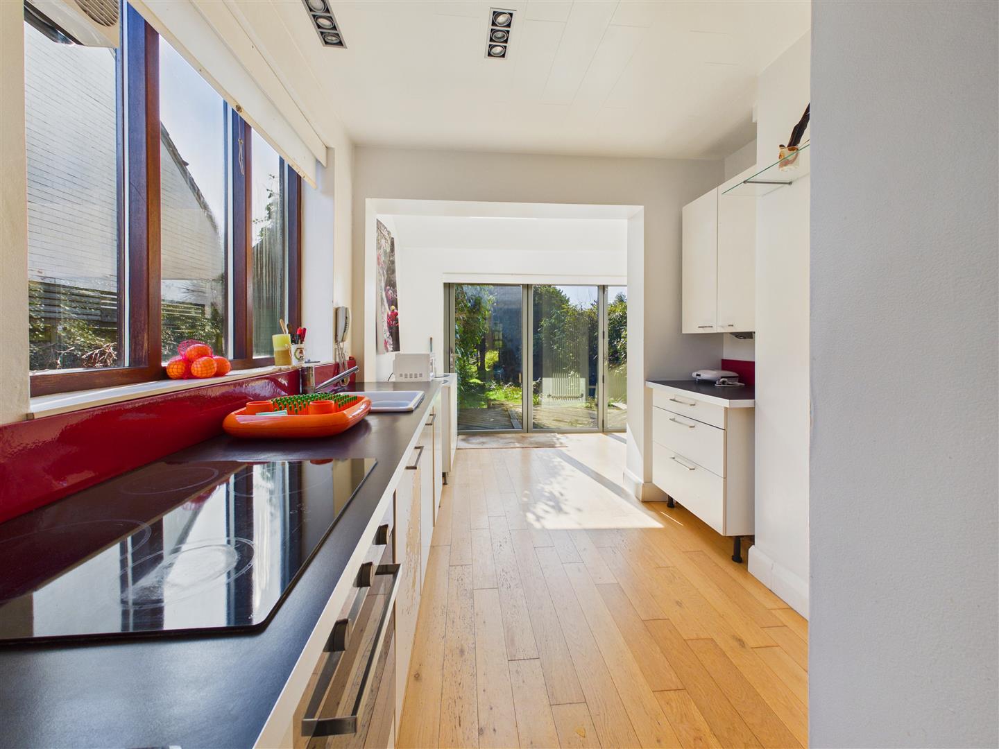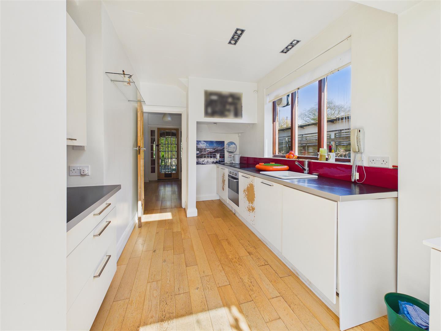 Comprising a range of fitted units and worksurfaces, integrated fridge and freezer and washing machine, four-ring electric hob, cooker and sink beneath window to the side.