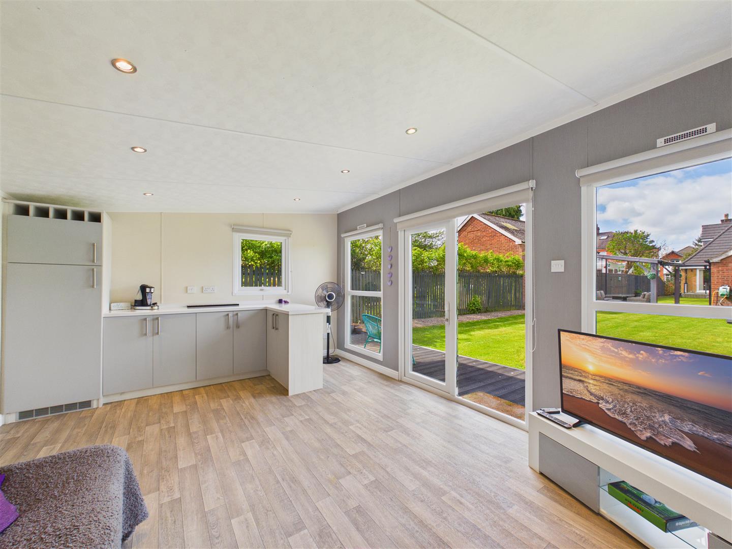 Feature summer house with fitted units and worksurfaces and French doors to decking.