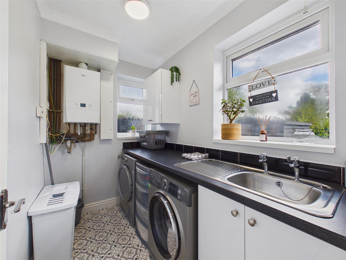 With sink & drainer atop fitted worksurface beneath window to the rear, plumbing for a washing machine, space for dryer and window to the side.