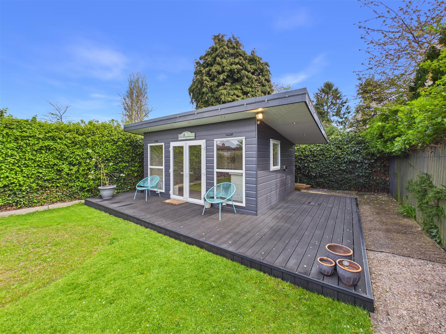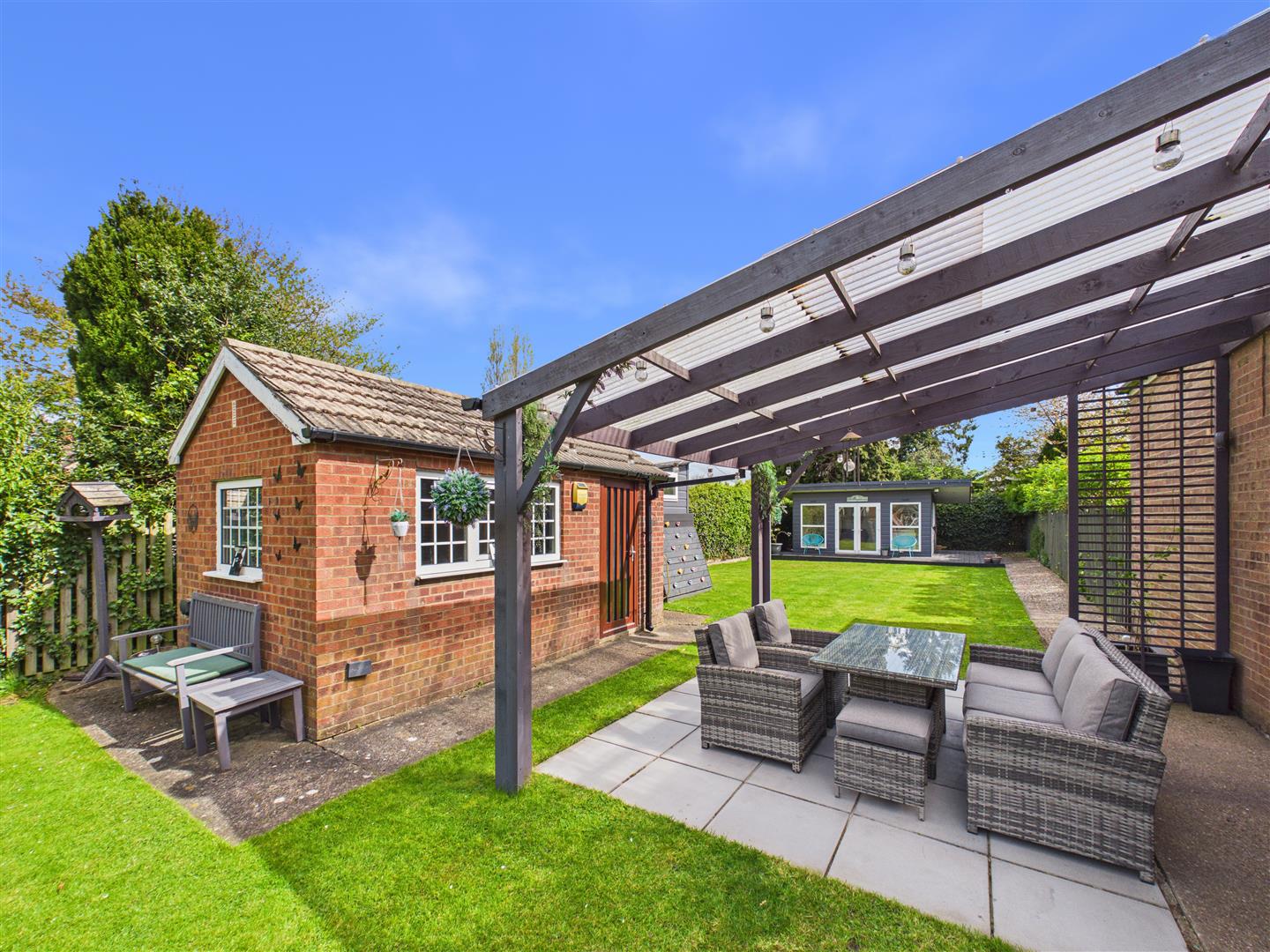 The exterior is a true highlight of the property. The rear garden is split into distinct zones for entertaining, including a deck to the immediate rear, an extensive lawn, and a central patio with a feature pergola. At the far end sits a recently constructed summer house—a versatile space complete with fitted units and French doors—ideal for a home office or hobby room. To the front, a generous driveway and gravelled area provide off-street parking for up to three vehicles, leading to the integral garage.