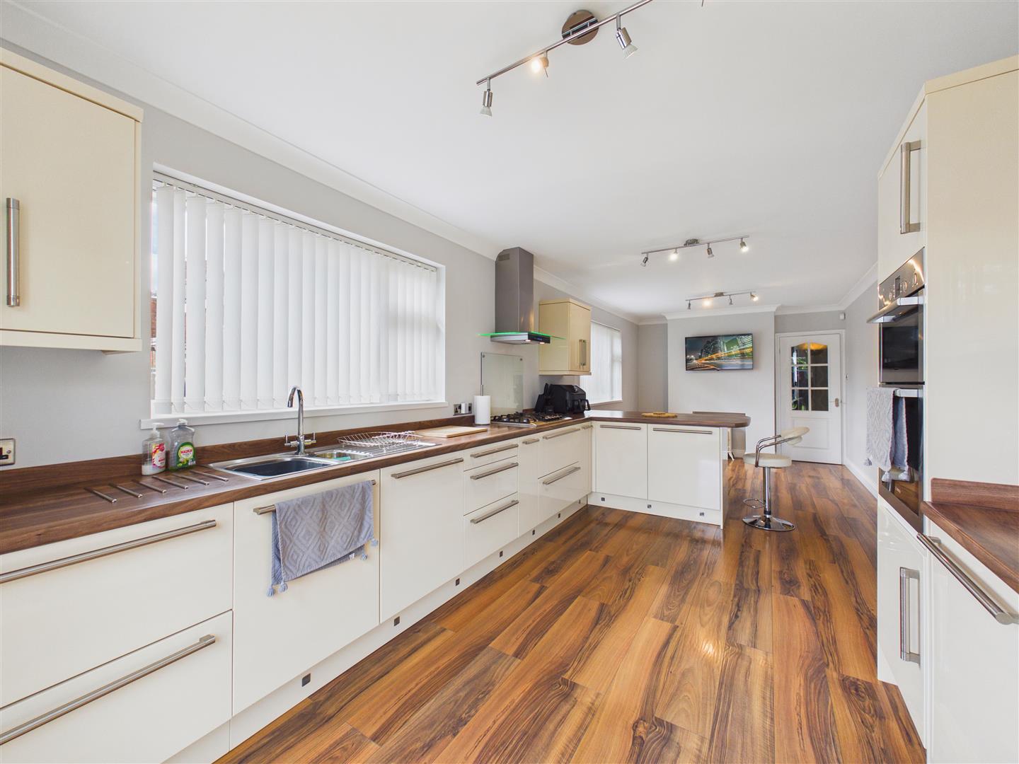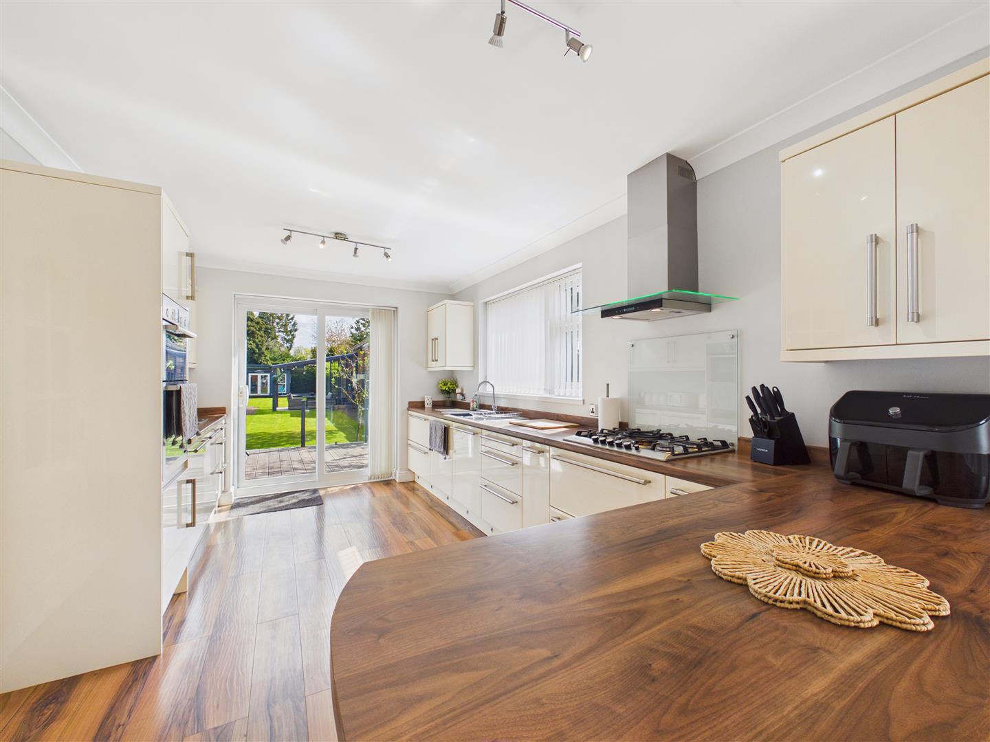 Comprising well presented, fitted units and worksurfaces throughout, one-and-a-half sink & drainer beneath window to side, five-ring gas hob with extractor unit above and integrated appliances including dishwasher, fridge, freezer and double-oven. There is a large breakfast peninsula, and sliding doors which open out onto the rear decking.