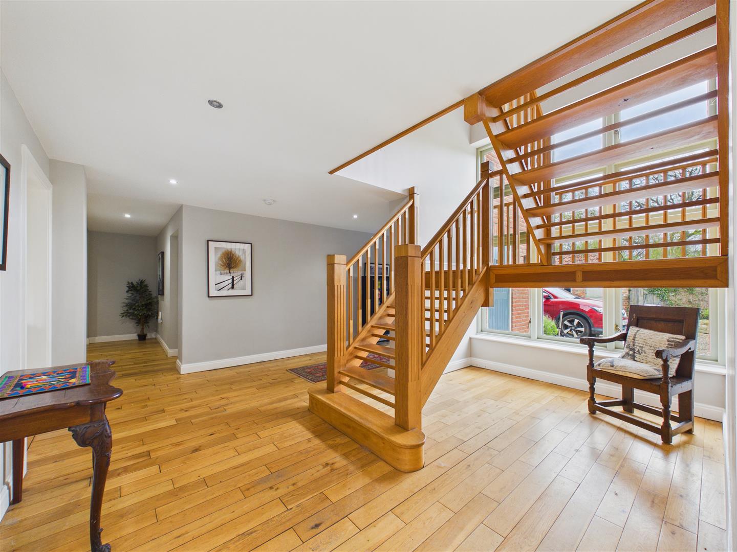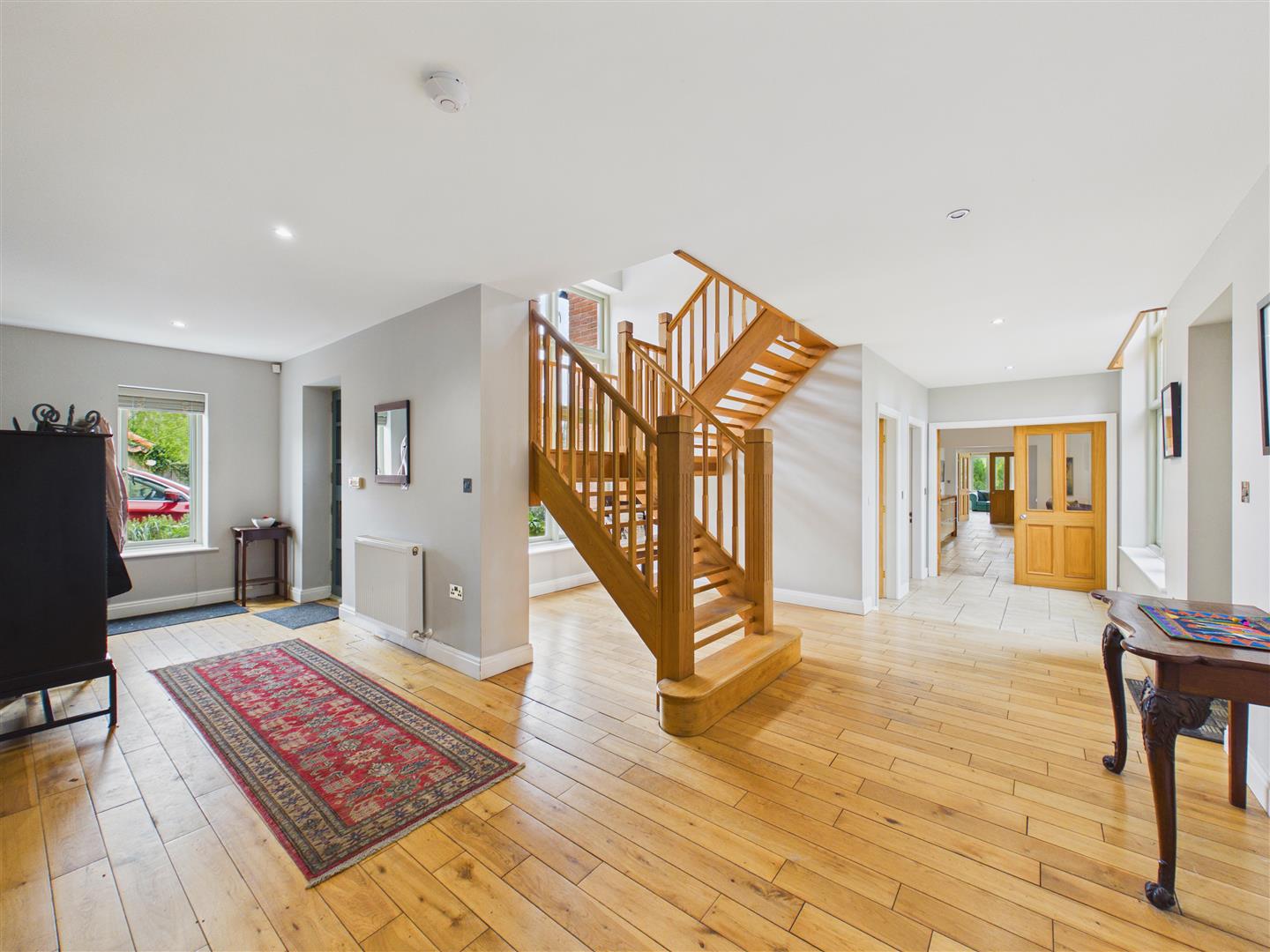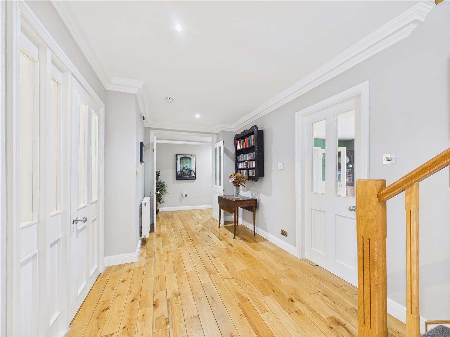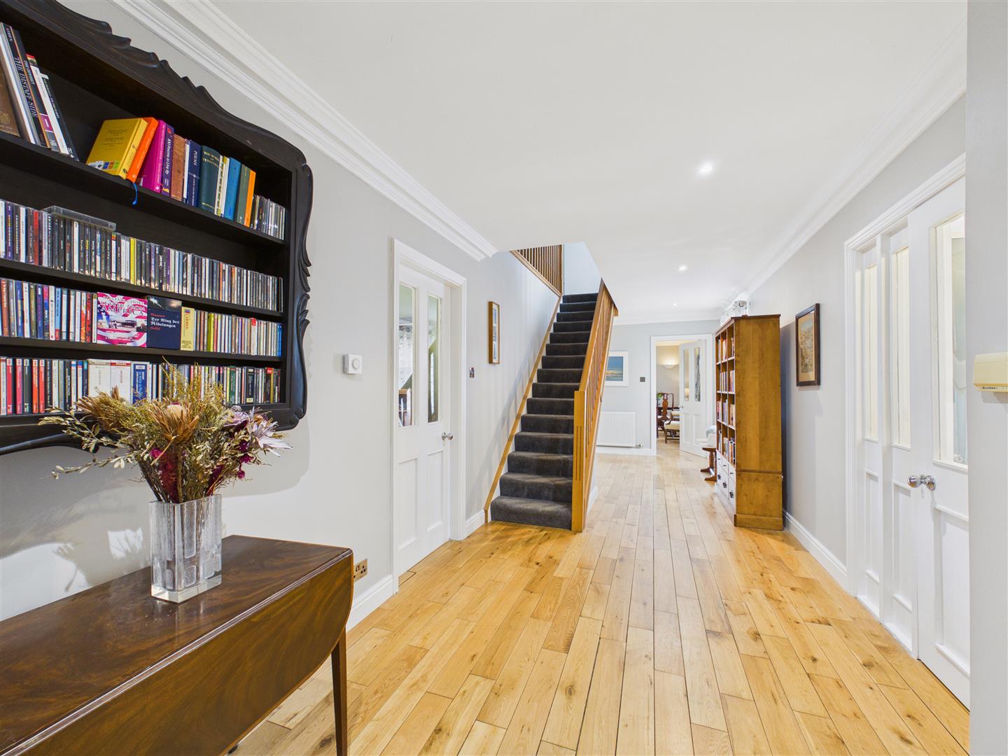 A spacious and welcoming hallway with oak flooring and staircase providing access to the first floor off.